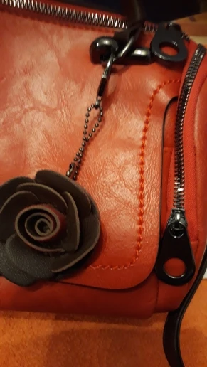 Красивая яркая сумка с подвеской в виде цветка. Смотрится красиво. Имеет много карманов и по бокам и с задней стороны. Описанию полностью соответствует.Качество отличное.Спасибо большое продавцу за прекрасный товар.
