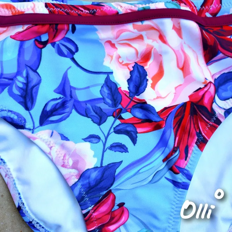 Модель довольно интересная и женственная. Для меня стало открытием красивое сочетание ягодного и голубого. Но все получилось гармонично Лиф по крою напоминает обычный бюст. Спереди пересекаются полосы ткани, а сбоку получаются разрезики. Ткань как обычно у купальников. На бирке указано: 80 % нейлон, 20 % спандекс Чашки формование, основа из поролона. Бретели не съёмные. Есть возможность регулировки. Фурнитура металлическая Застёгивается лиф сзади на металлический крючок Трусики средней посадки. Расцветка отличается. Здесь больше синего и голубого. Но в поддержание верха, на трусиках, ближе к резинке,расположена полоска ягодного цвета. И такие же лилии и розовые розы. Внутри есть подклад. Ластовицы как таковой нет. Была гигиеническая наклейка. На мои 85 - 66 - 93 взяла в размере М. Перепутала, хотела соцельный в этом размере, а этот как всегда С-ку. Верх оказался чуток большой, а вот трусики идеально сели.