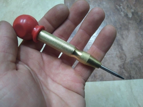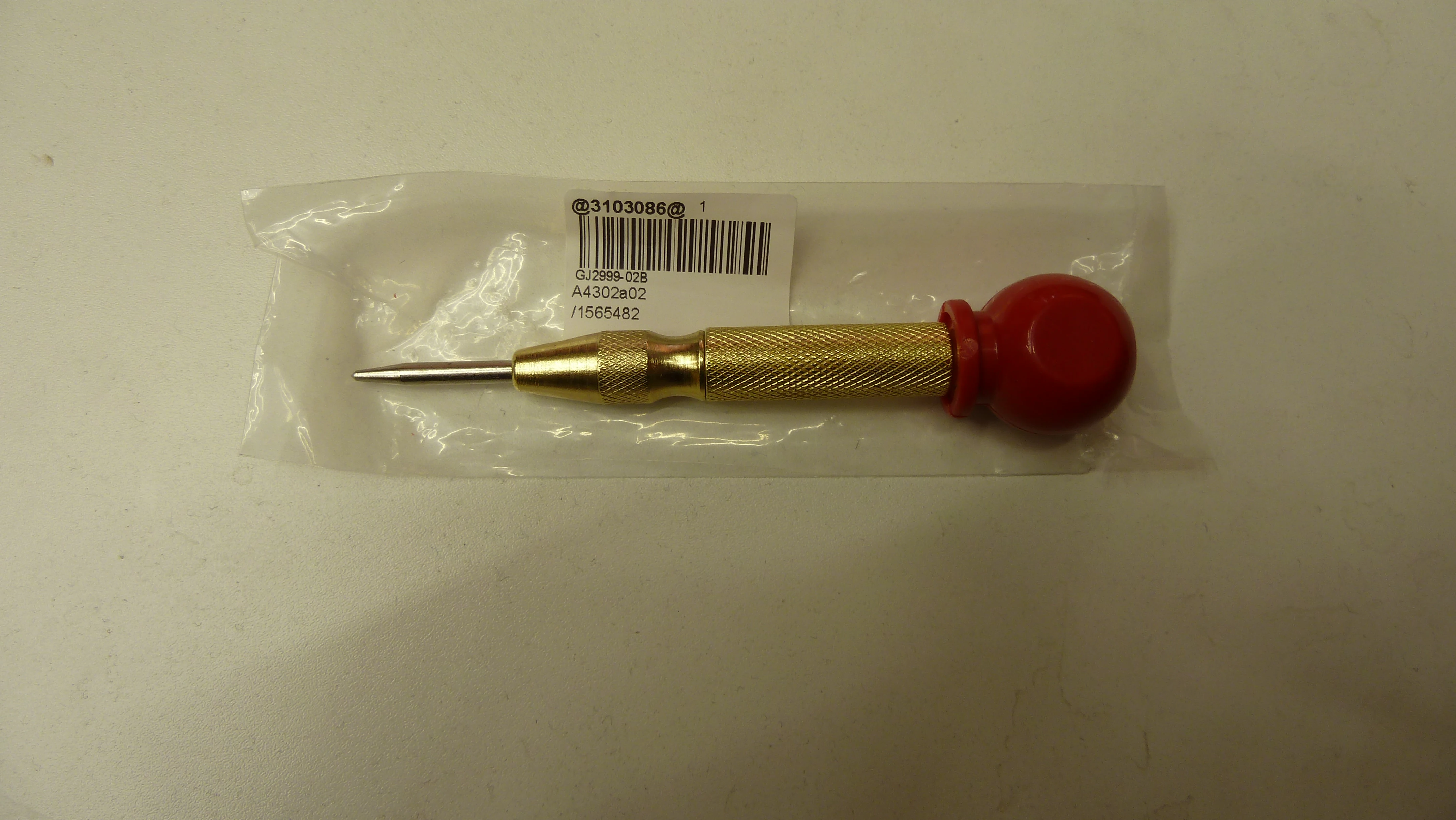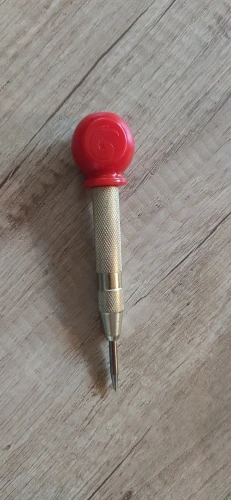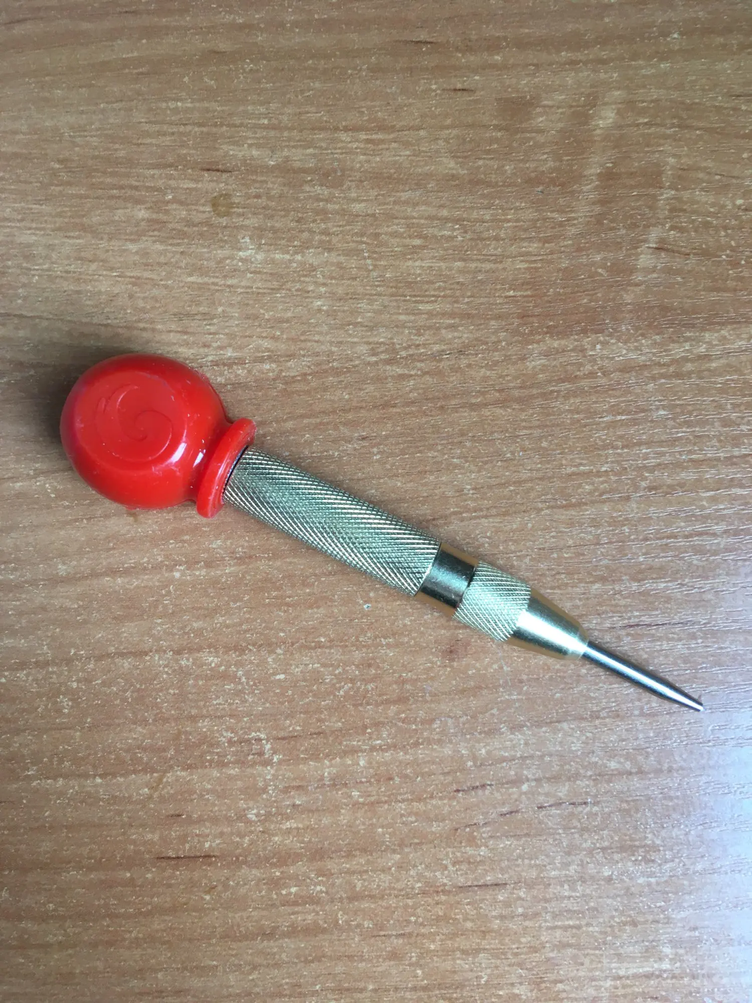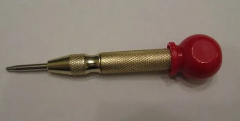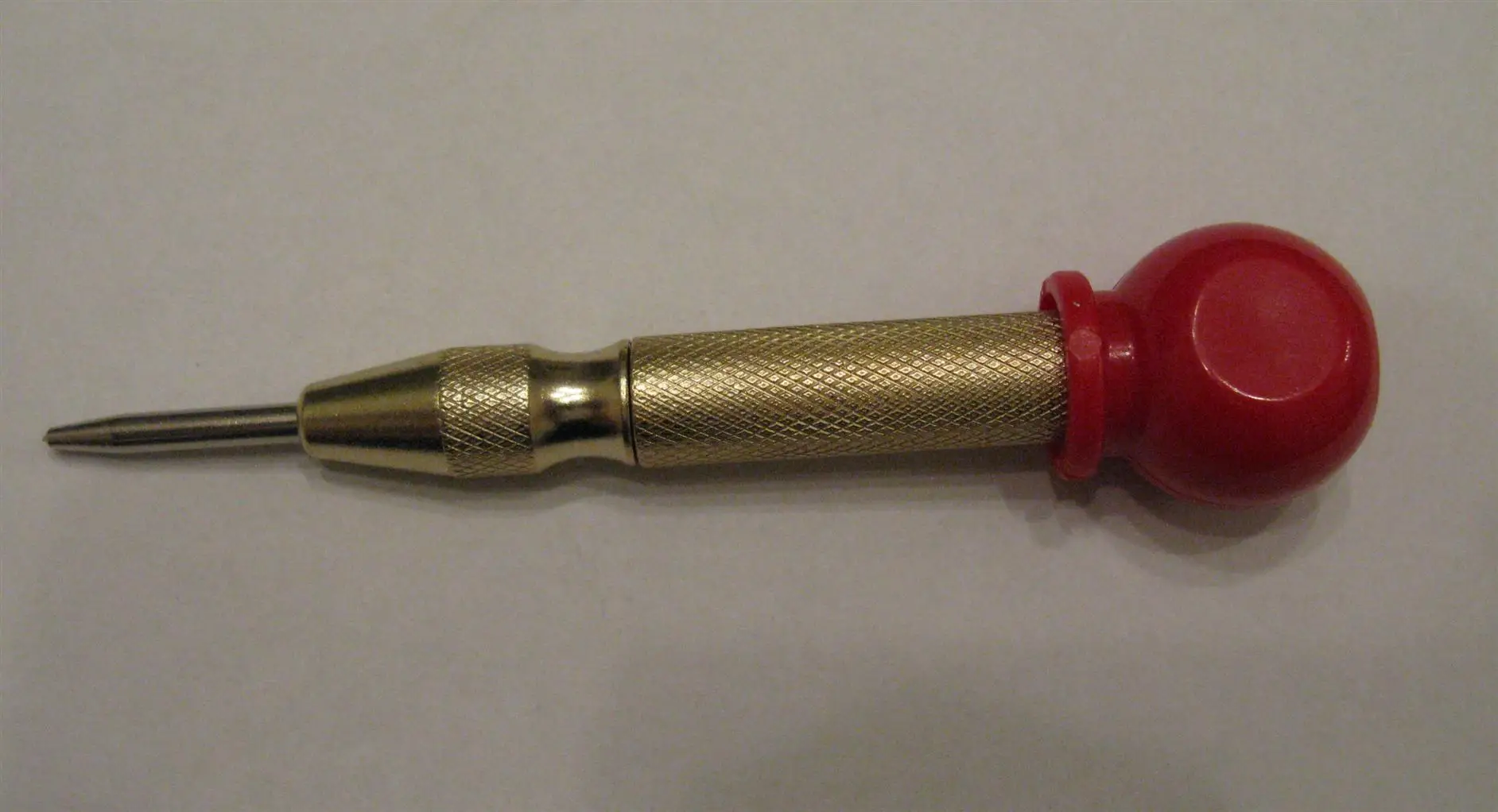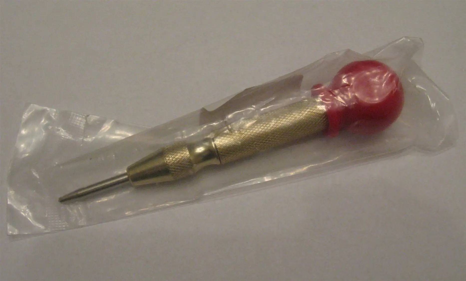 удобная и полезная вещь, спасибо. сердечник из прочной стали, удобная ручка с пластиковым шарообразным упором для ладони, при нажатии срабатывает механизм натяжения пружины, и если продолжить нажатие происходит спуск, срабатывает ударный механизм, и на металле остаётся вмятина примерно в 0.5мм. всё срабатывает за одно нажатие с которым справляется восьмилетний ребёнок.
