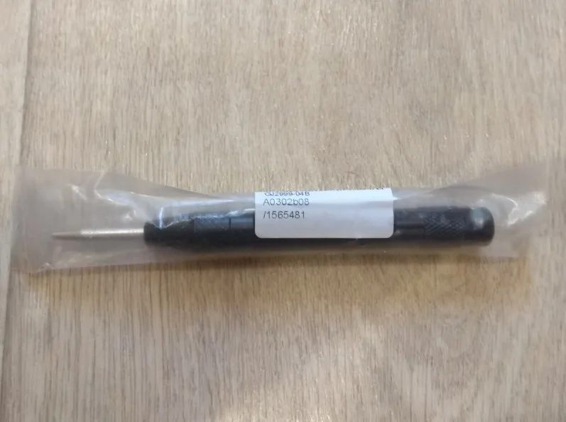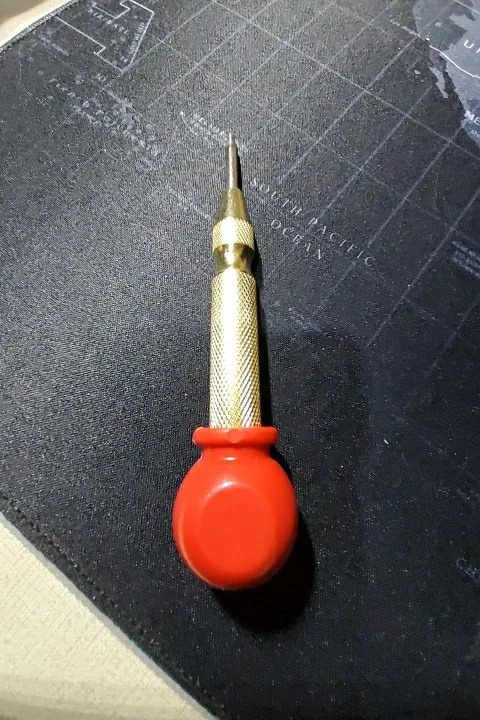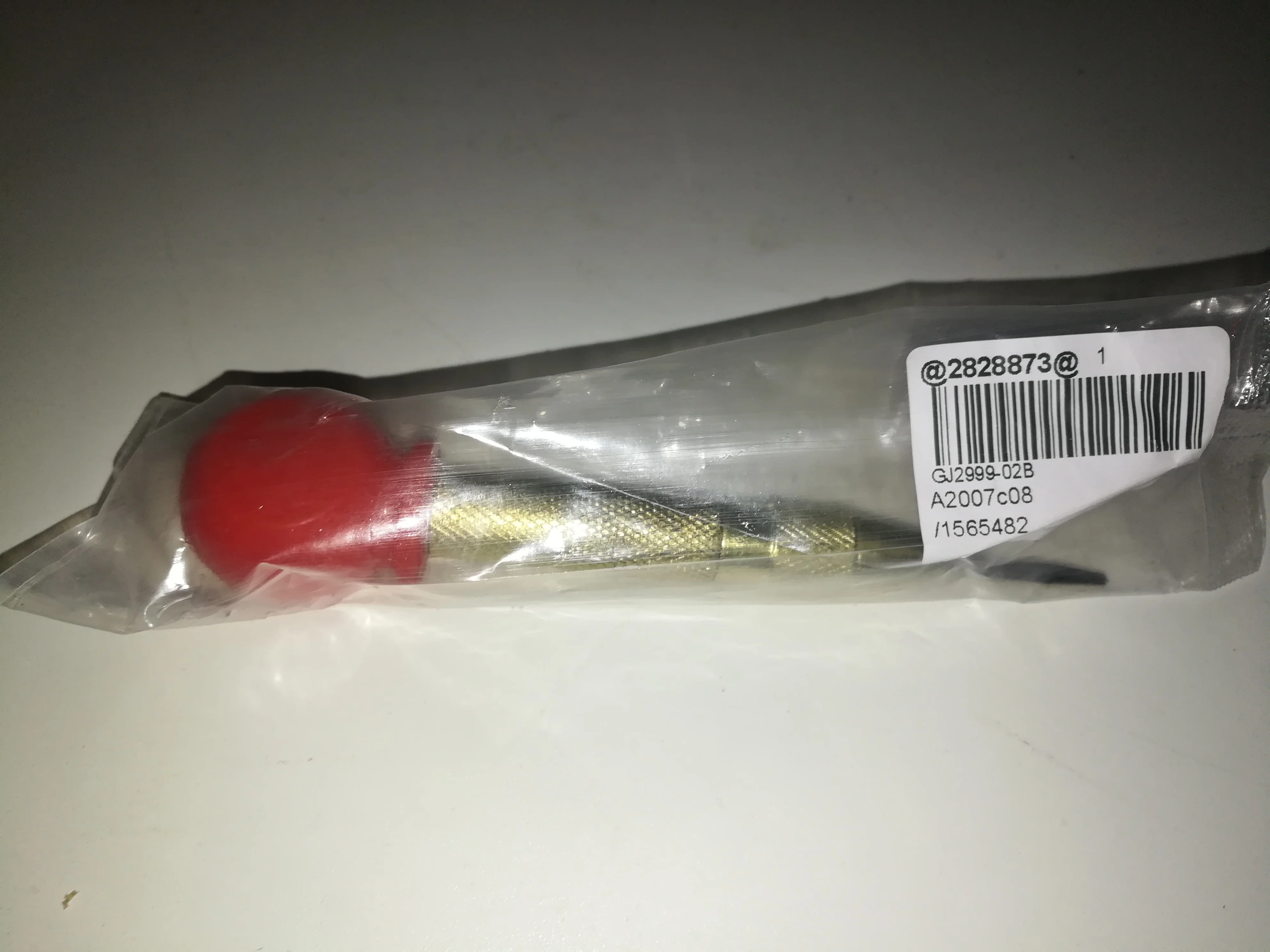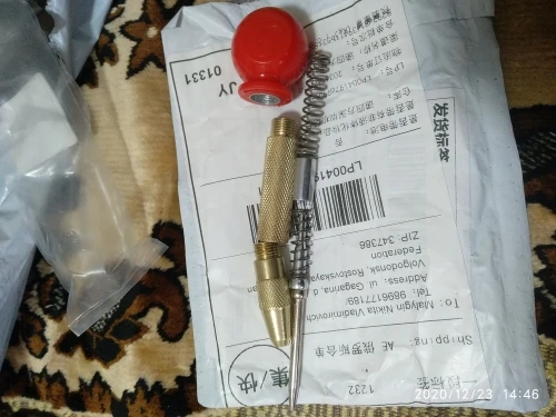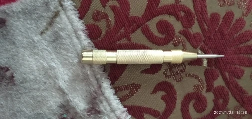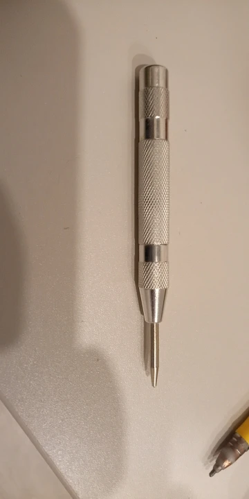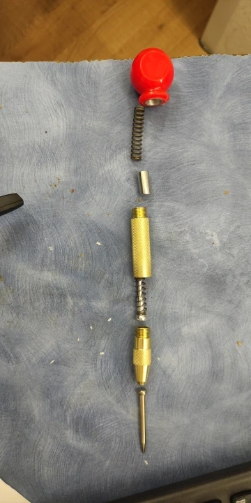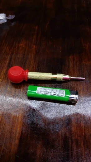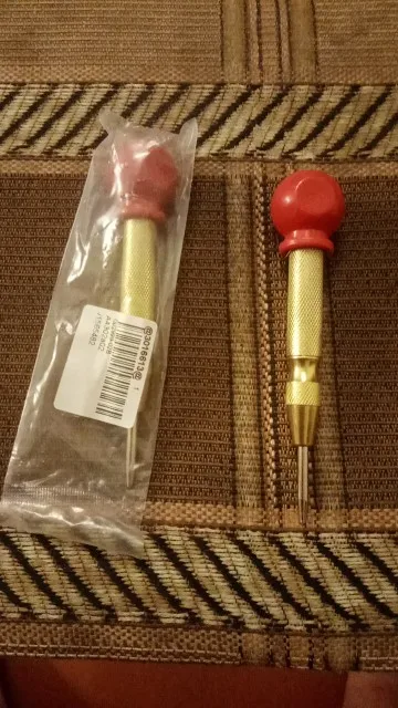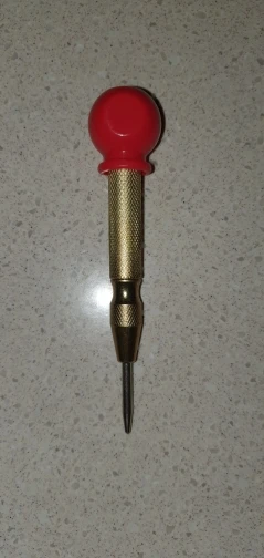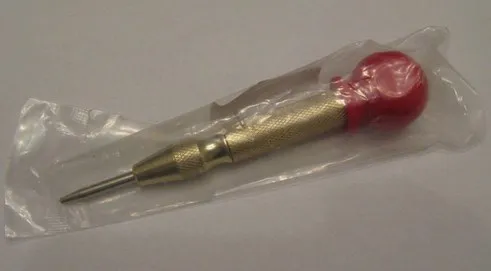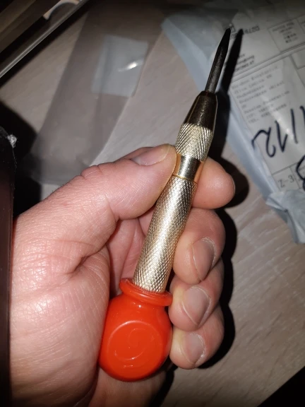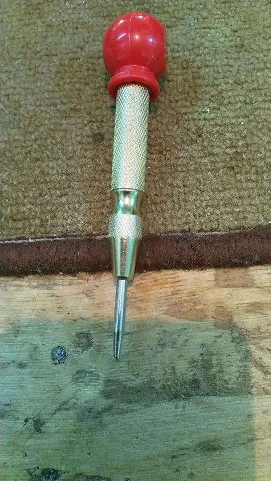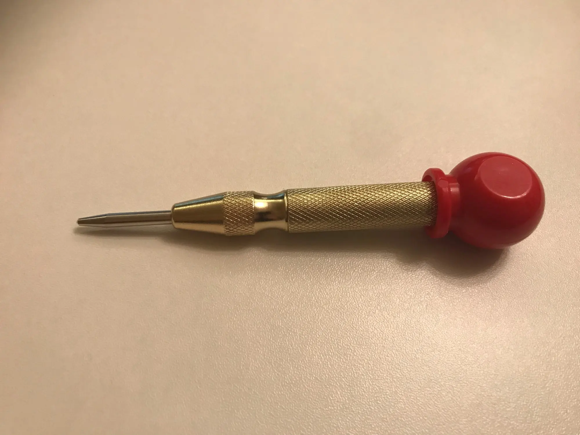 удобная и полезная вещь, спасибо. сердечник из прочной стали, удобная ручка с пластиковым шарообразным упором для ладони, при нажатии срабатывает механизм натяжения пружины, и если продолжить нажатие происходит спуск, срабатывает ударный механизм, и на металле остаётся вмятина примерно в 0.5мм. всё срабатывает за одно нажатие с которым справляется восьмилетний ребёнок.
