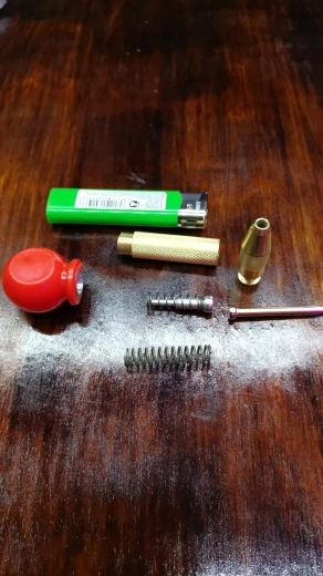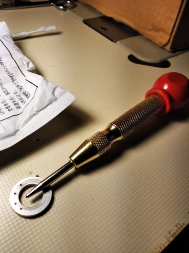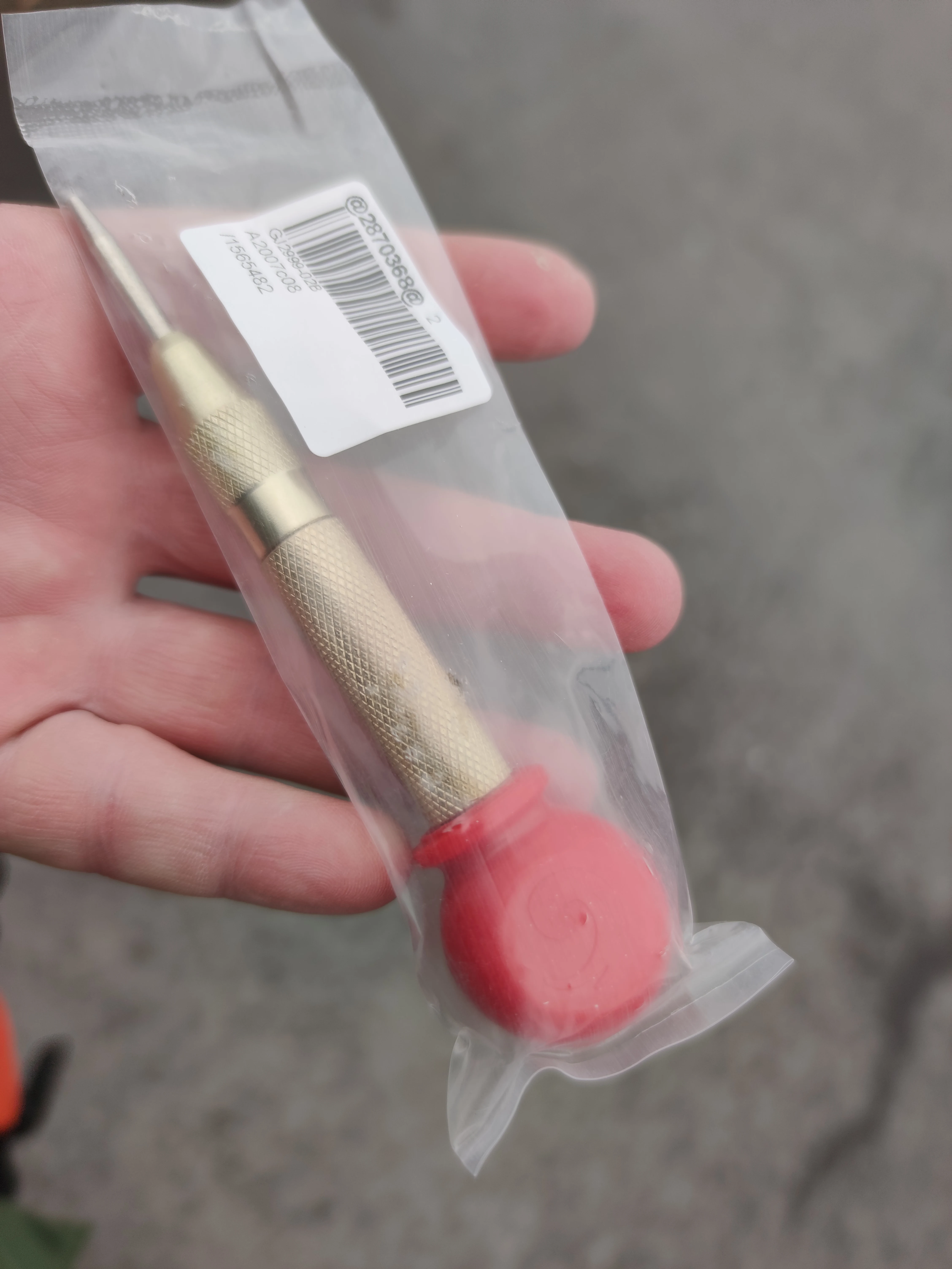 Брал с красным наболдашником. Он, кстати, служит задней крышкой: внутри прямо в пластике нарезана резьба и в него упирается пружина. Как бьёт - мне понравилось, есть чёткая точка. Проверял на металлопрокате (труба квадратная 10мм) и на арматуре. На фото мягкая сосновая дощечка и советская стальная "ложечка" для обуви.