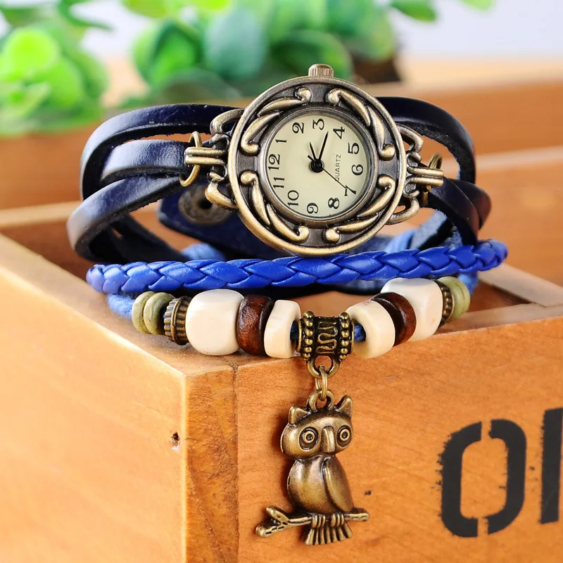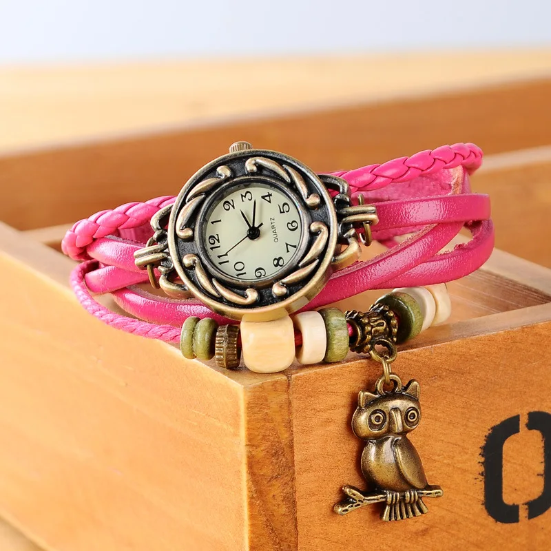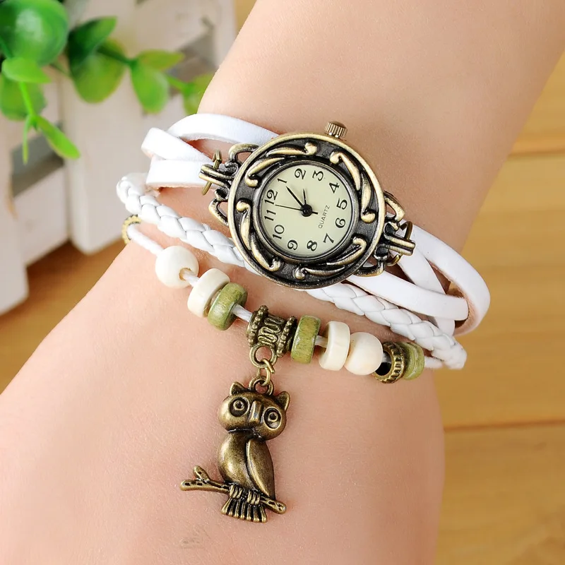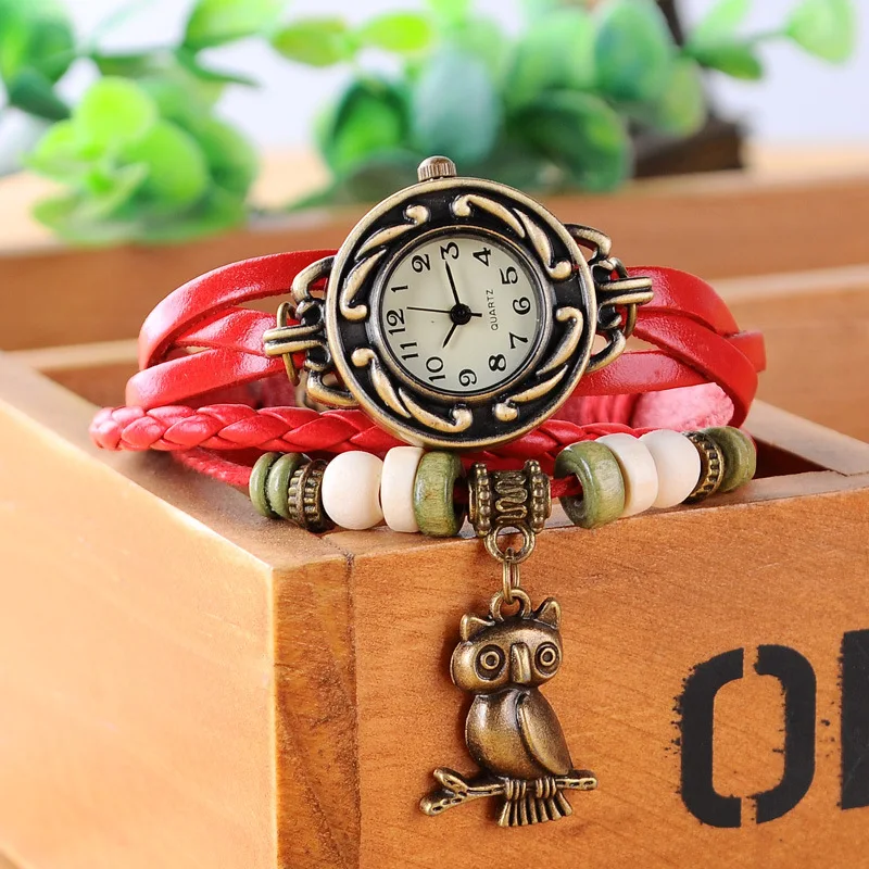 Женские часы с подвеской в виде совы, элегантные винтажные наручные часы из искусственной кожи с деревянными бусинами, 2019