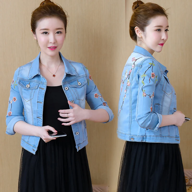 Куртка-бомбер джинсовая женская с цветочной вышивкой, элегантная винтажная модная верхняя одежда из денима, L2875, весна-осень