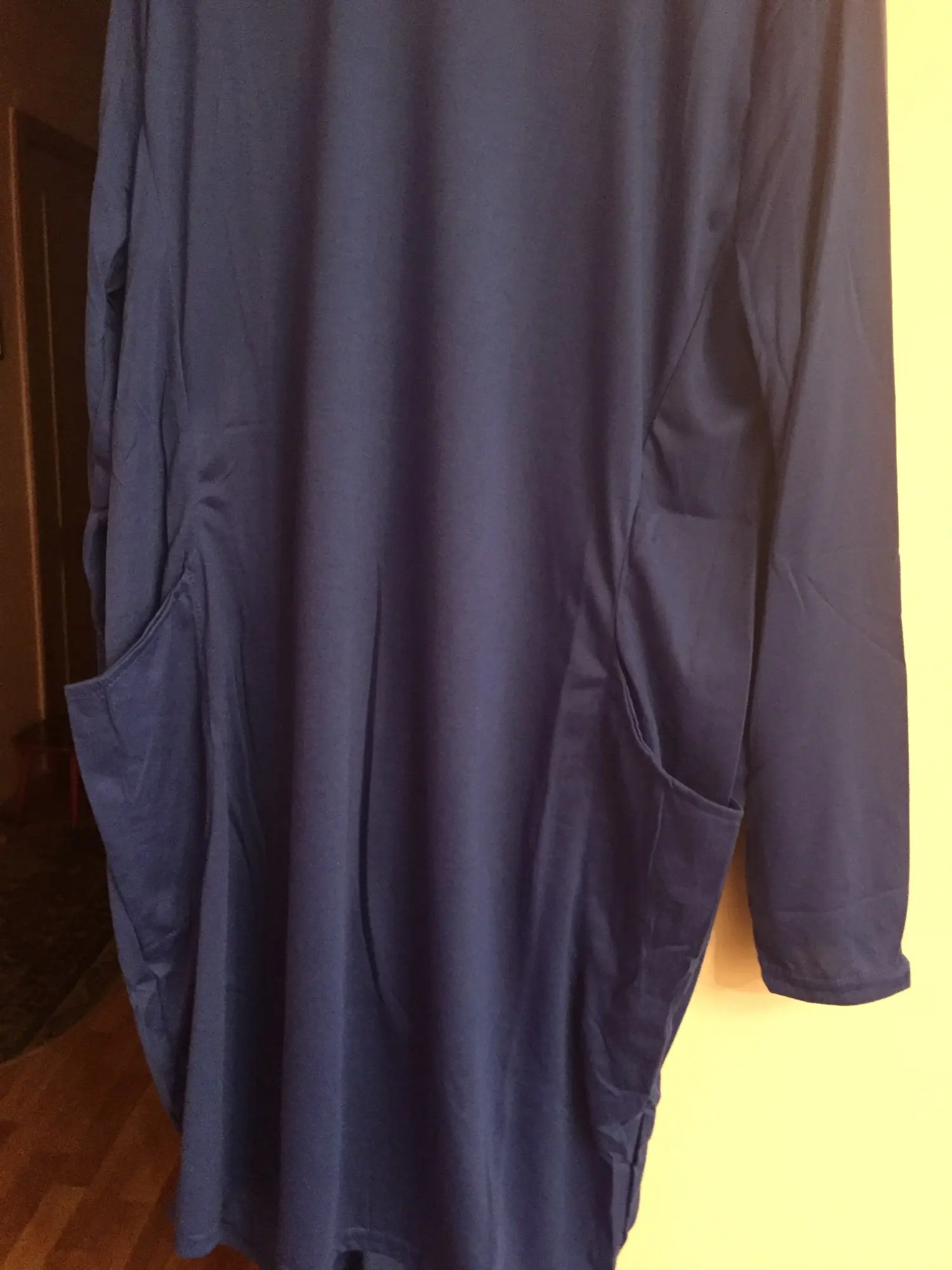 Платье короче, чем в описании. Размер 3XL не 99 см, а 87 см. 12 см - это много. Соответственно карманы и изгибы платья тоже находятся выше, выглядит клоунски. Жаль. Задумка была хорошая. Вот ткань норм - 35% хлопок/65% полиэстр - приятный, после стирки платье не село.