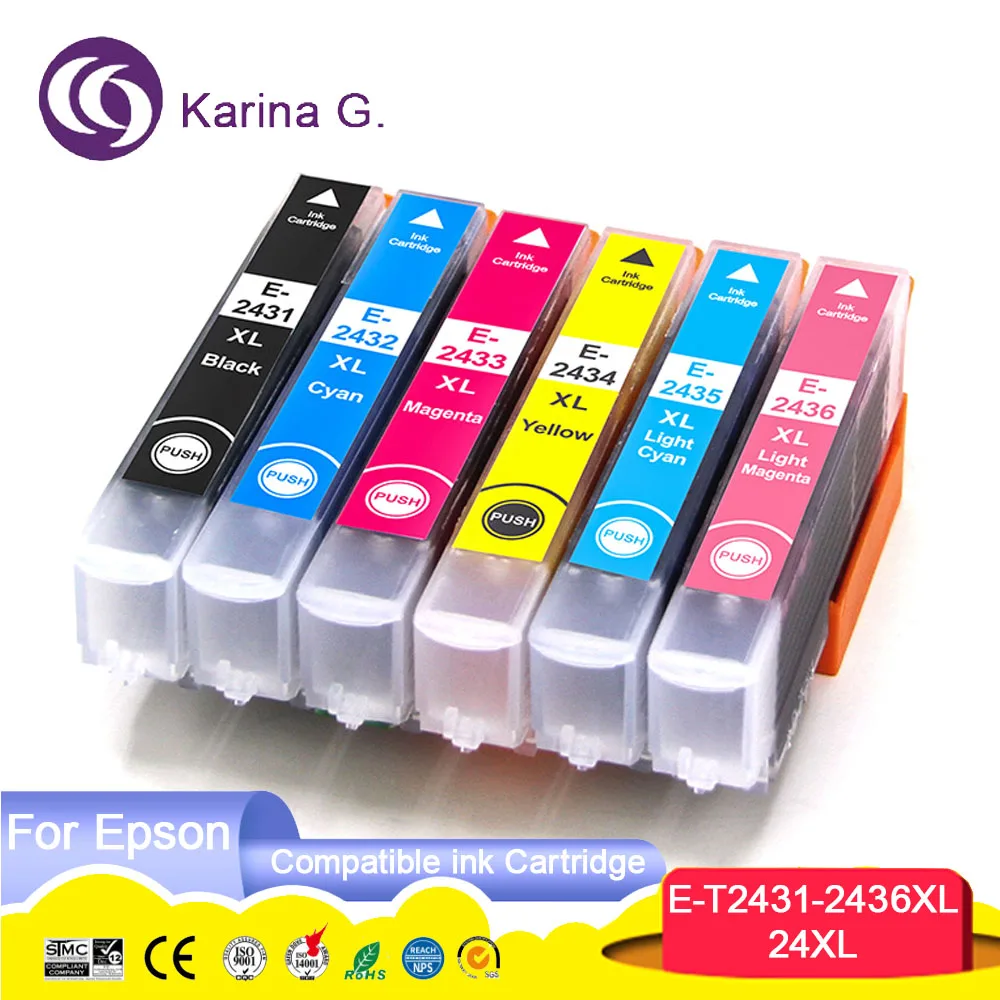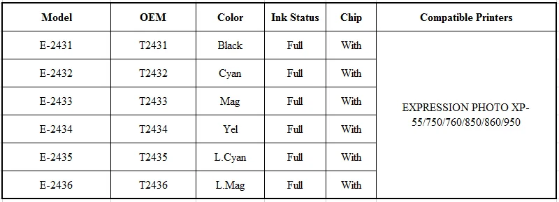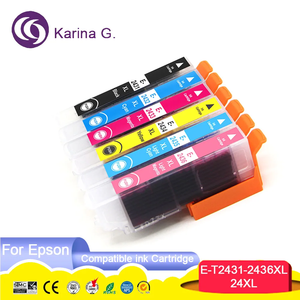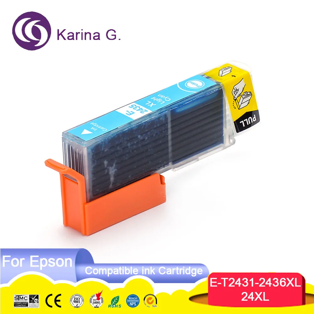 Название продукта: совместимый чернильный картриджНомер картриджа: E-T2431 T2432 T2433 T2434 T2435 T2436Цвет: BK C M Y LC LMСостояние картриджа: полный с черниламиЧип: установка со стабильным чипомСрок годности: 24 месяца