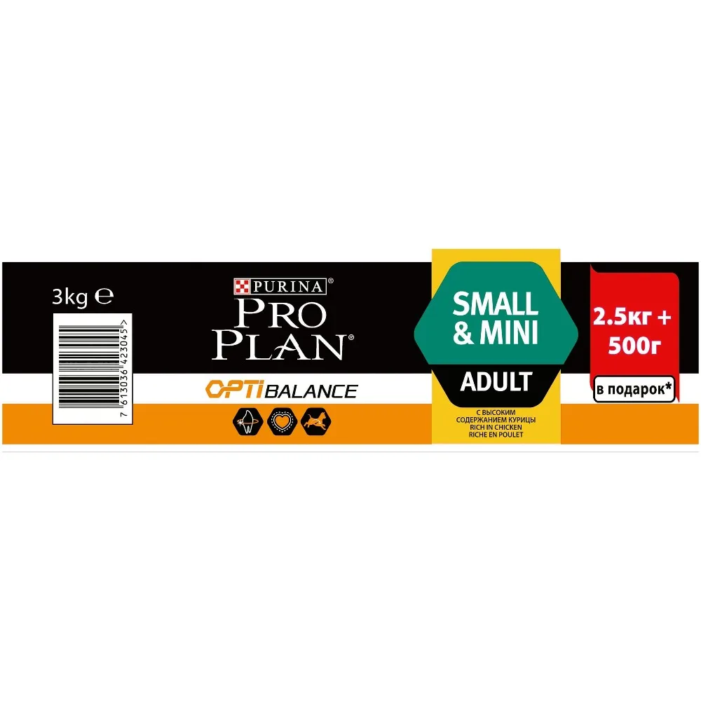 Сухой корм Pro Plan для взрослых собак мелких и карликовых пород с комплексом OPTIBALANCE с высоким содержанием курицы, Пакет, 2,5 кг + 500г
