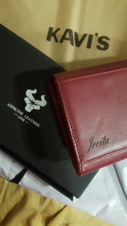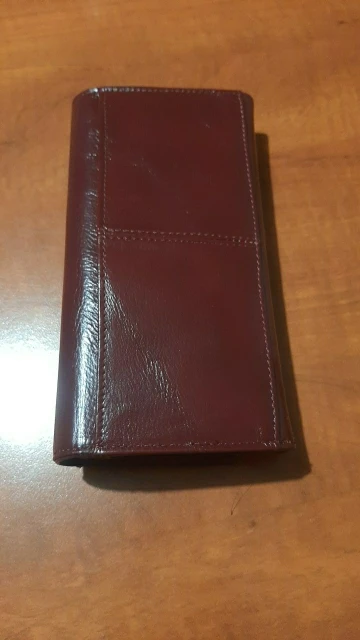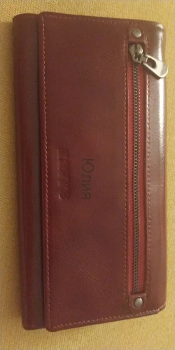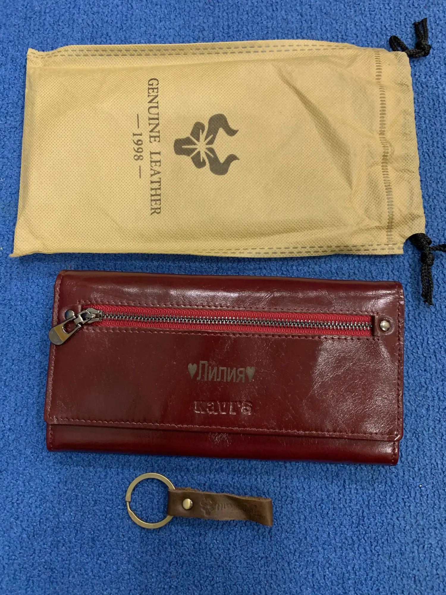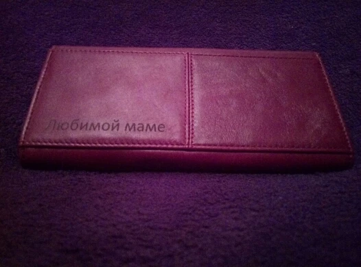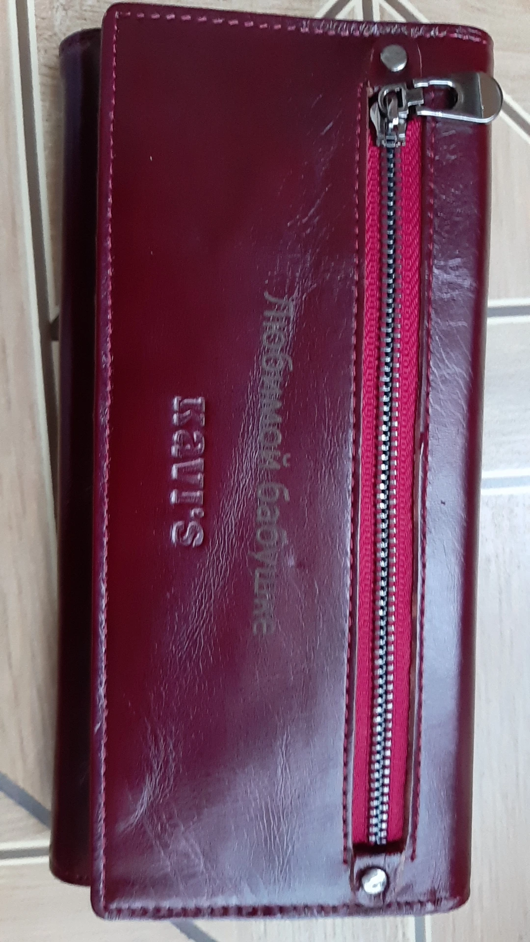 Кошелёк пришёл очень быстро за 16 дней,упакован в коробку и в пакет, описание соответствует, цвет винный красивый, яркий, есть небольшой запах, кожа мягкая,смотрится не дёшево, продавец сделал гравировку как просила. Всё очень супер, спасибо продавцу!!!