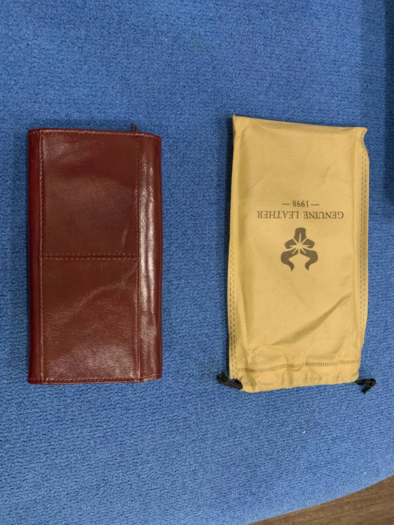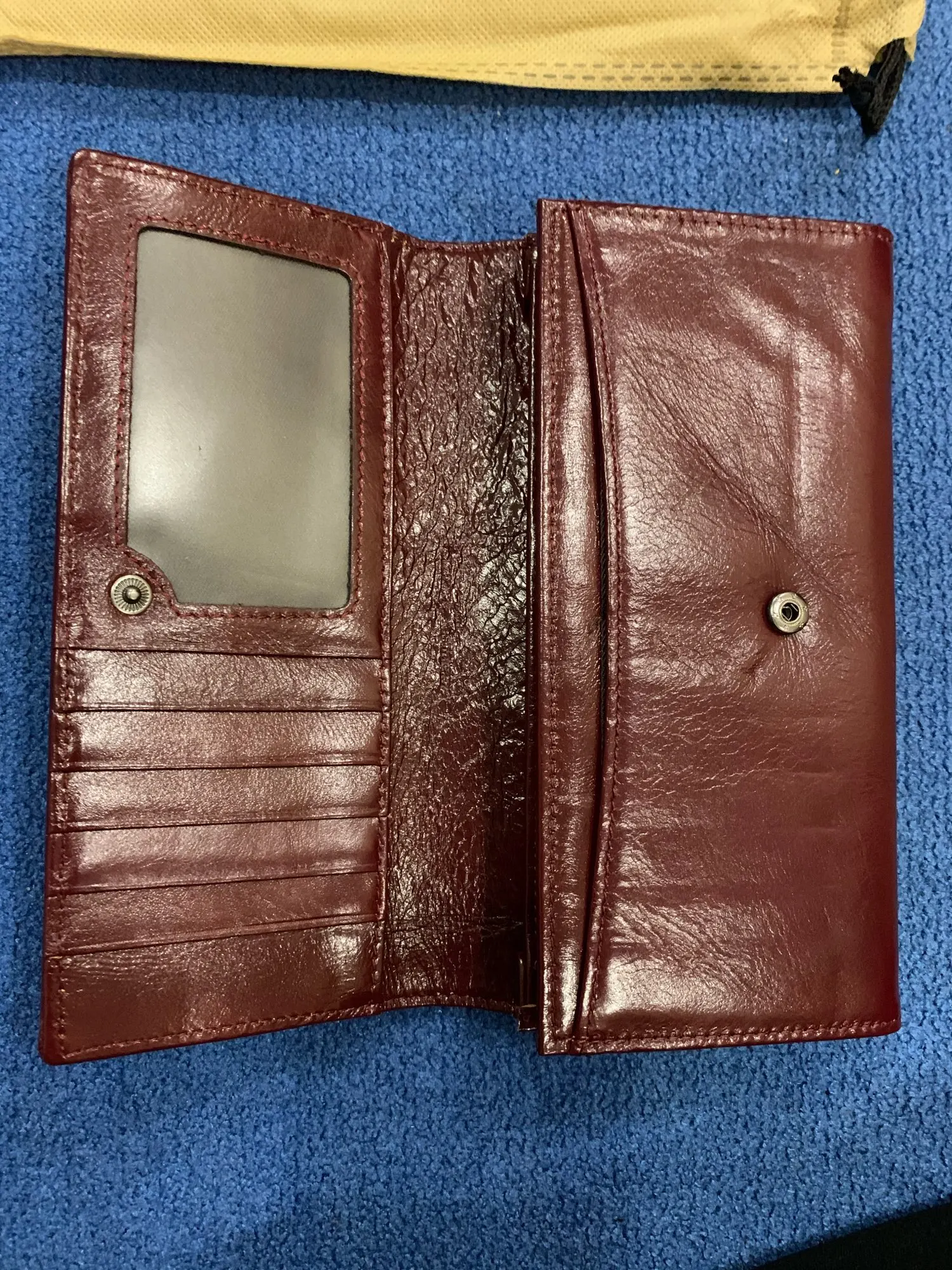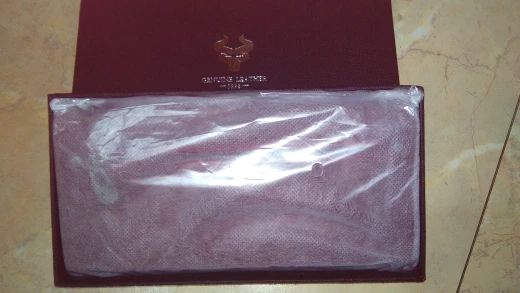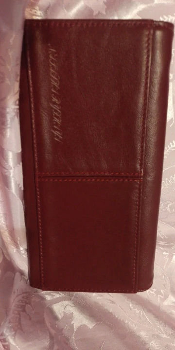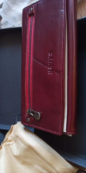 Кошелёк пришёл очень быстро за 16 дней,упакован в коробку и в пакет, описание соответствует, цвет винный красивый, яркий, есть небольшой запах, кожа мягкая,смотрится не дёшево, продавец сделал гравировку как просила. Всё очень супер, спасибо продавцу!!!