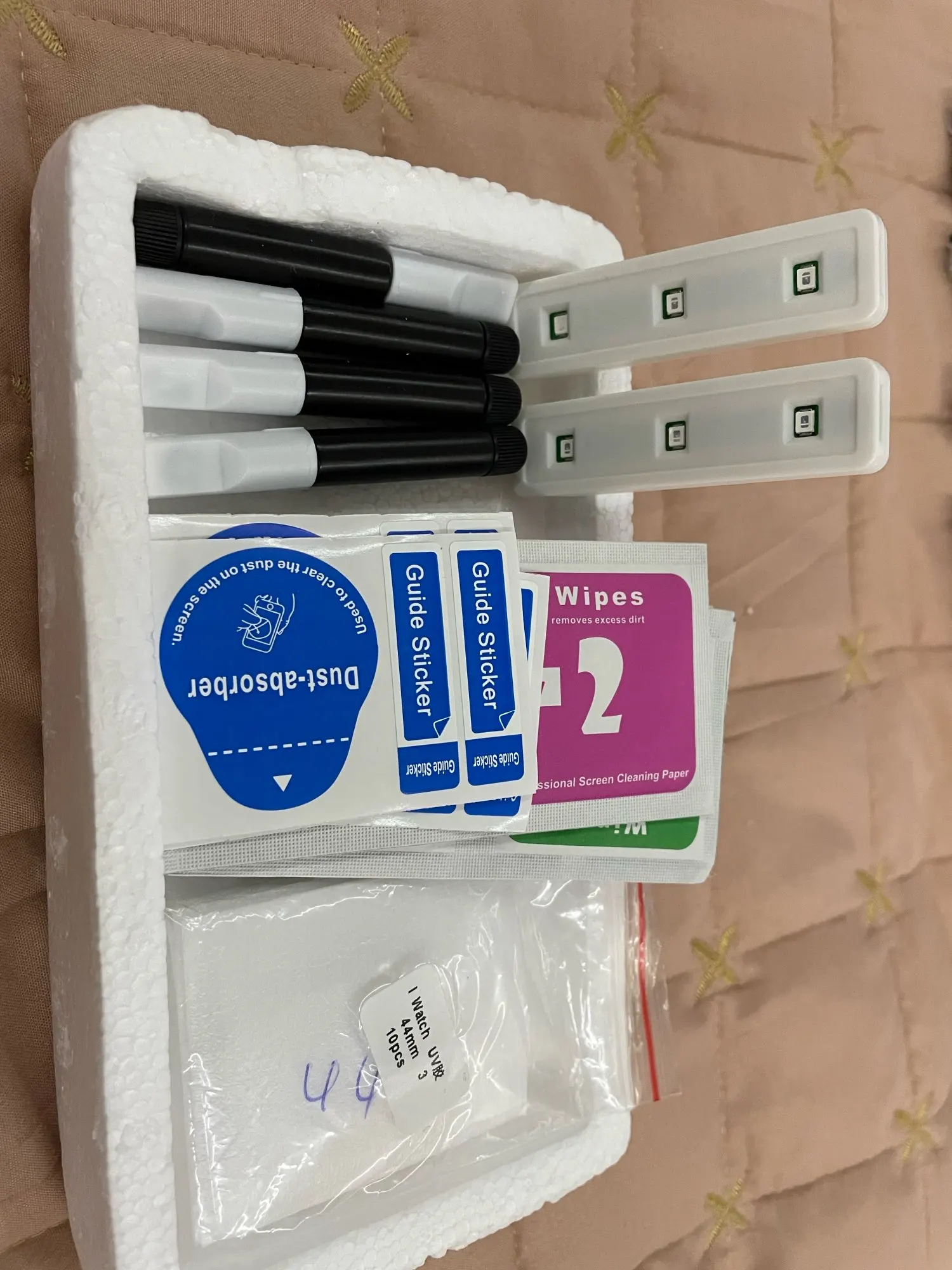 Заказывала для 3-х разных размеров экрана Apple Watch (40, 44 b 45 SE7). Пришло все в одной коробке из пенопласта (супер упаковка - ничего не помялось). 4 комплекта чистящих салфеток и липких наклеек, а также 2 УФ лампы, которые можно запитать как от USB-s так и от microUsb разъема. Пока не клеили. После дополню отзыв.