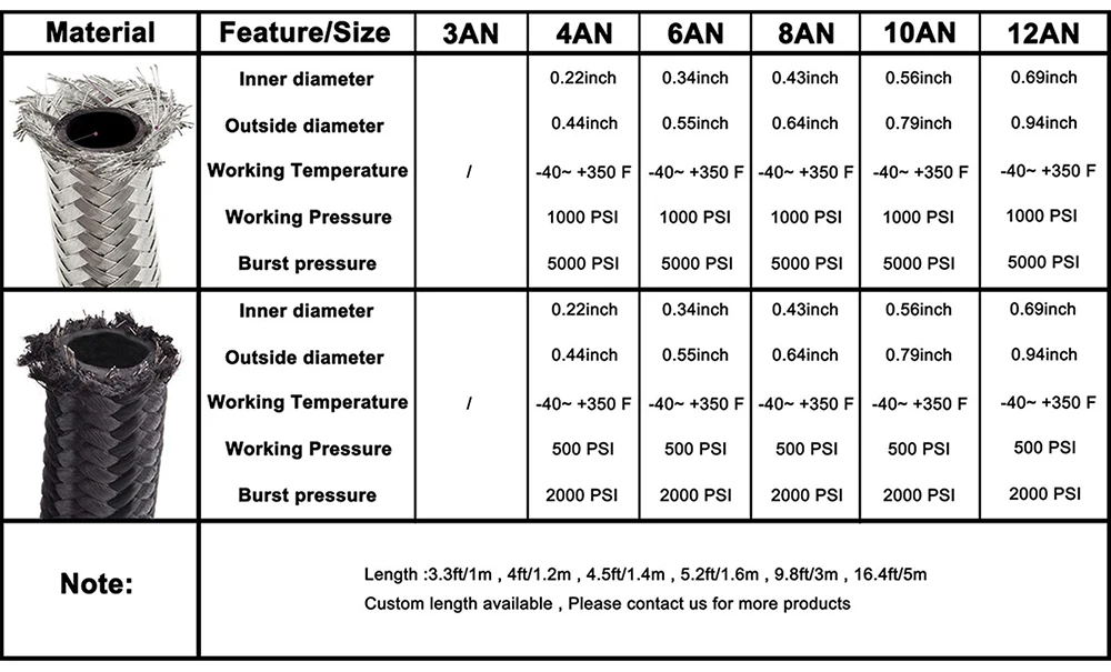 Размер шланга: AN4 AN6 AN8 AN10 AN12Внутренний диаметр нейлонового шланга: 2,2 мм/3,4 мм/5,2 мм/5,6 мм/6,9 мм