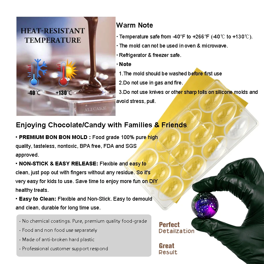 1. Используйте пищевой пластик, соответствующий FDA и SGS.2. Наши формы тяжелее, толще, прочнее и имеют более длительный срок службы!3. Отсутствие вредных веществ, обеспечение безопасности и здоровья!4. Мы осуществляем бесплатный возврат во многие страны!5. Поверхность формы гладкая и не подвержена царапинам.