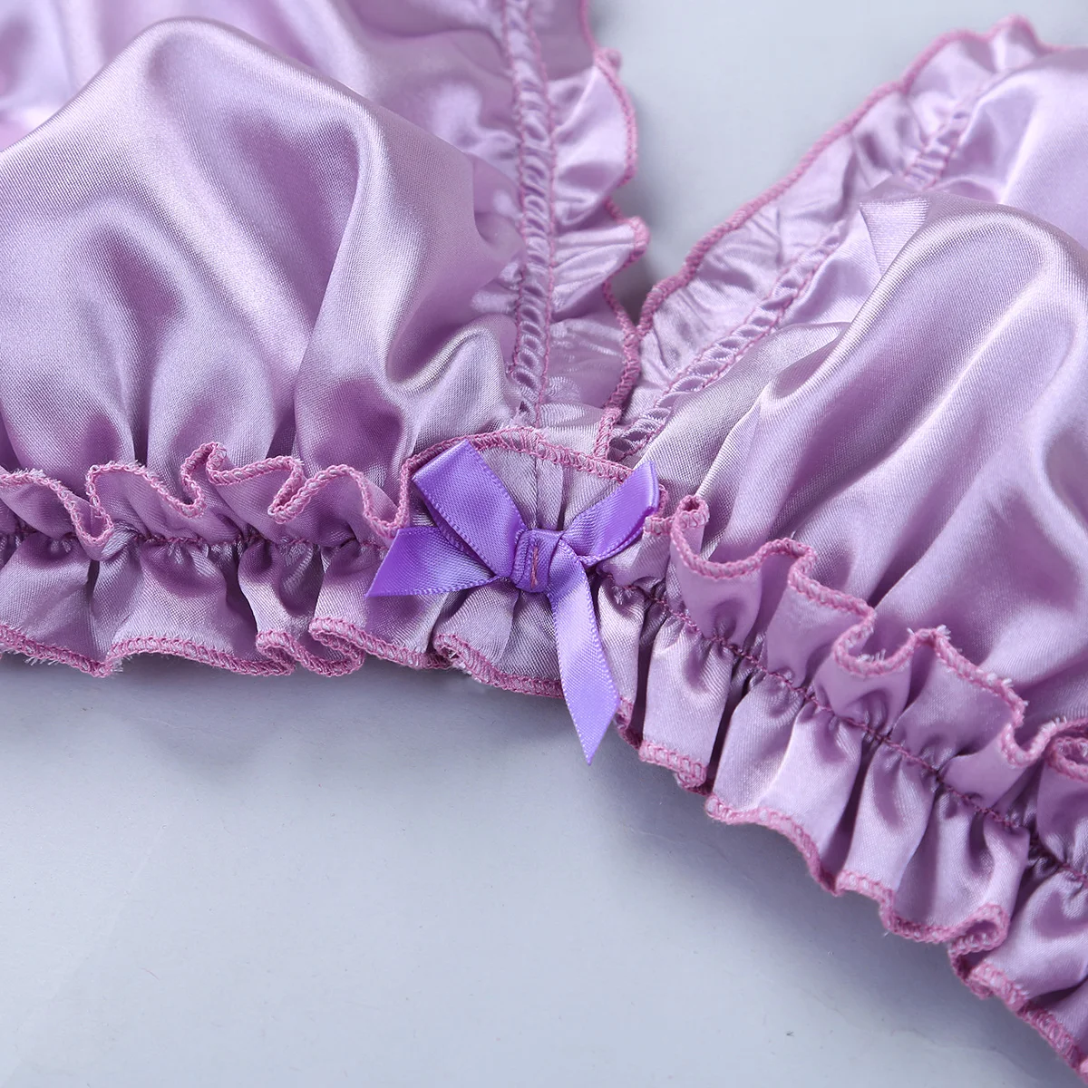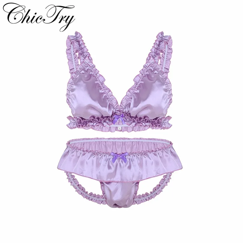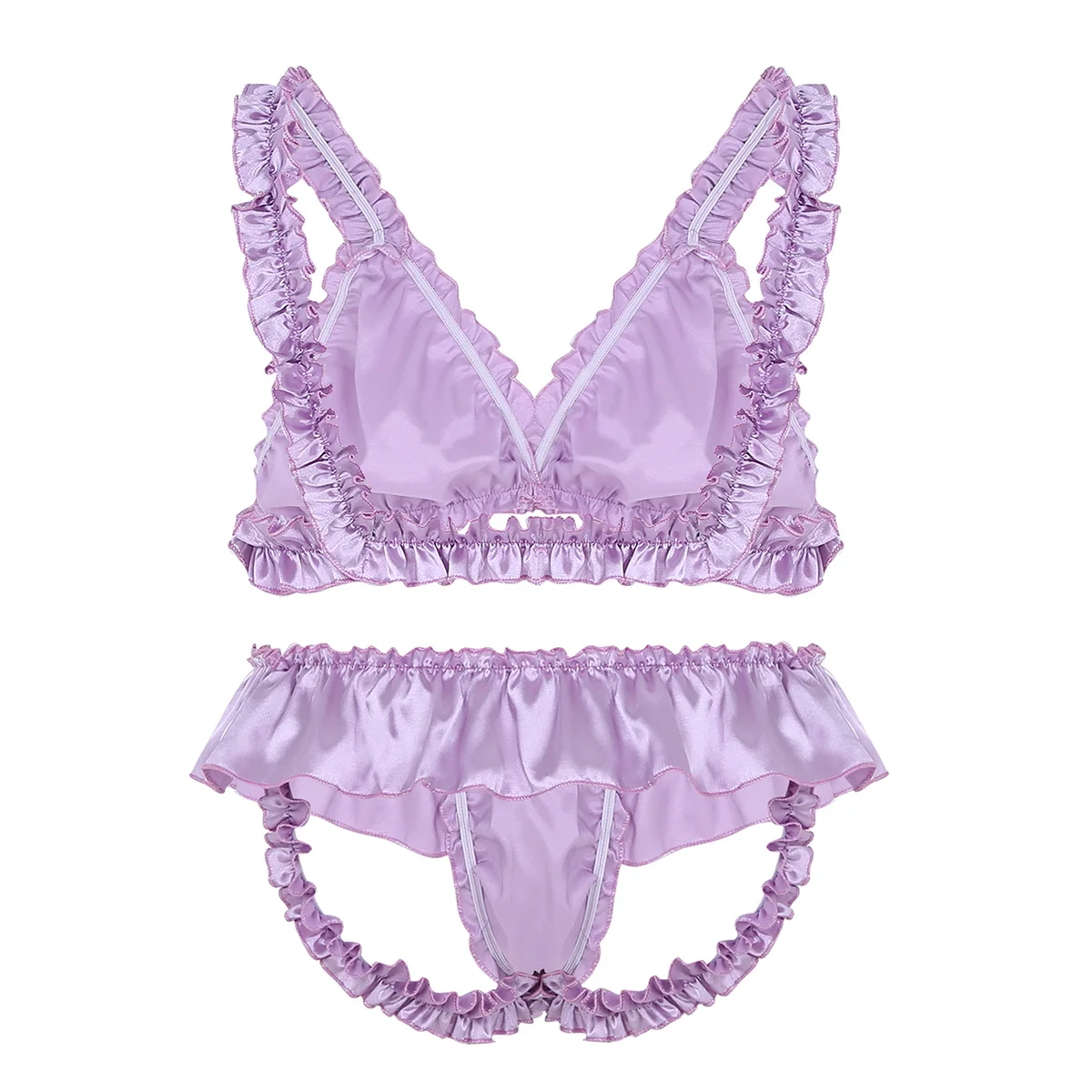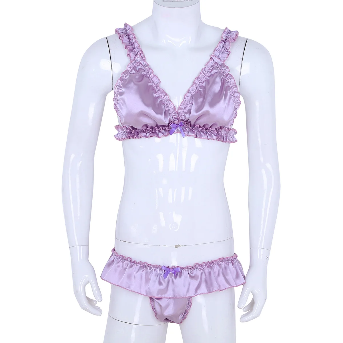 Мужское нижнее белье Sissy, Трусы из мягкого атласа, эластичное Плиссированное нижнее белье с оборками, комплект с бюстгальтером-бикини с открытой спиной, g-стринги