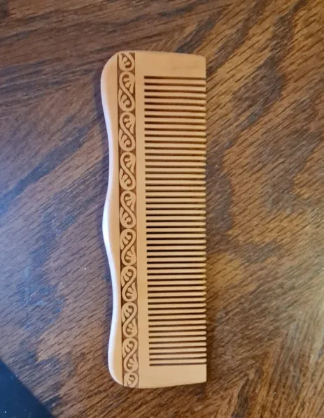 Это красивая расческа, она очень хорошо расчесывает волосы, я использовал ее после мытья гладких волос, и она не удаляет мои волосы, она оставляет их гладкими, мне очень понравилось. Дерево отличного качества, с хорошей отделкой и гравировкой, которая напоминает штраф бабушки. Это очень хорошо построено. Он прибыл в Колумбию через месяц. Это соответствует описанию. Спасибо. Спасибо.