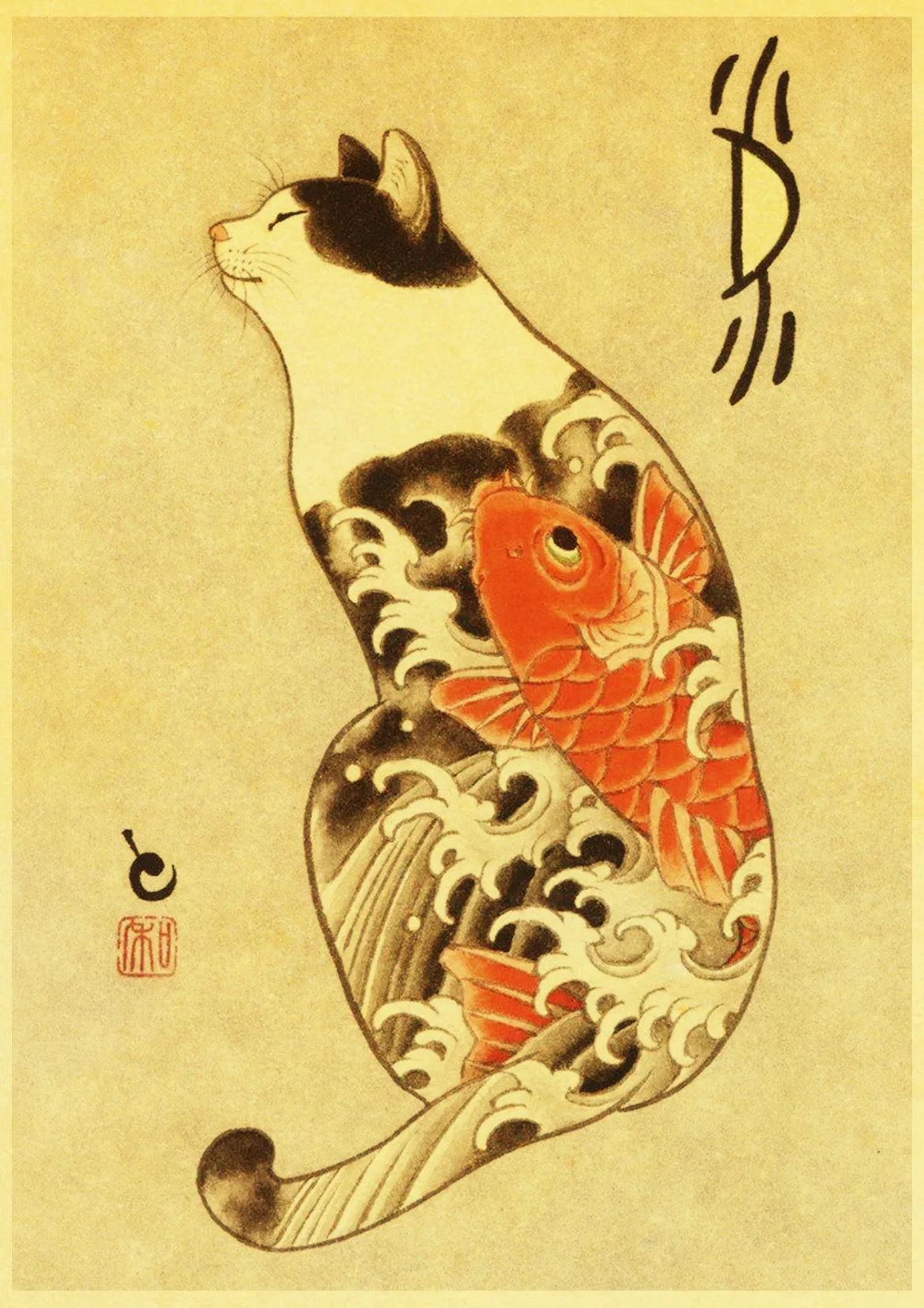 Тату Кот с японским самурайским котом и ретро постер винтажный, настенная художественная живопись, украшение для гостиной и спальни, наклейки на стену