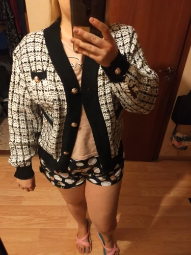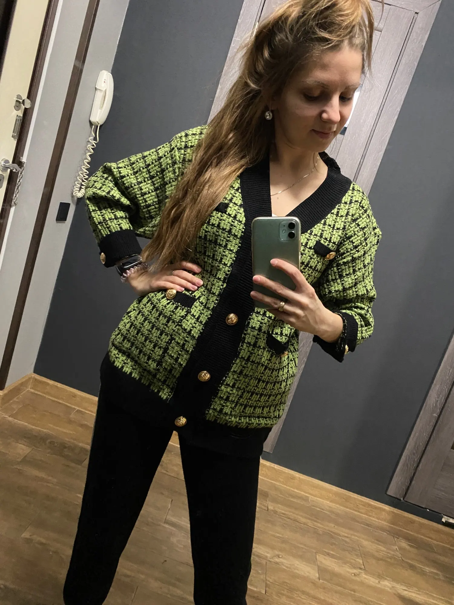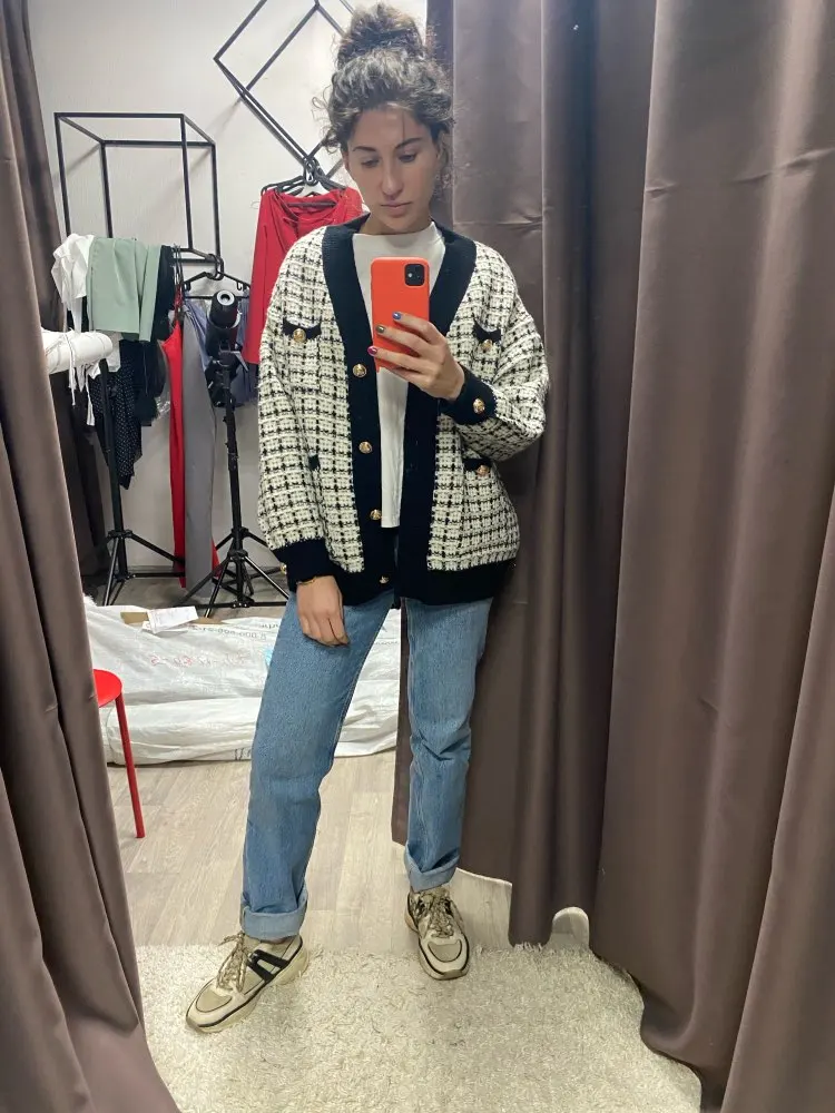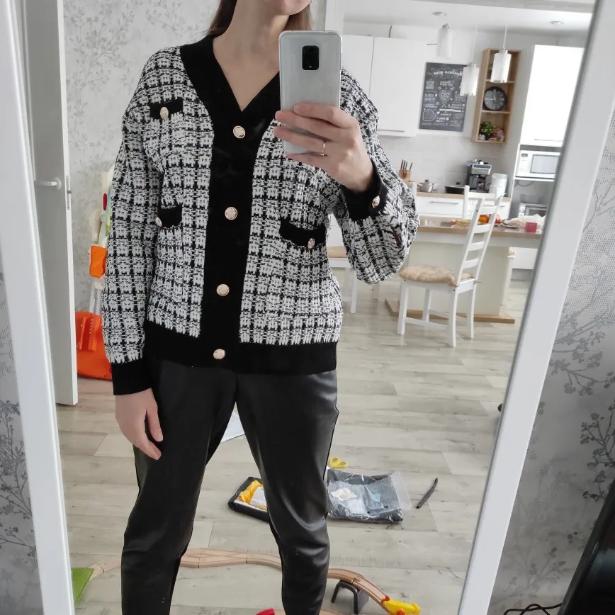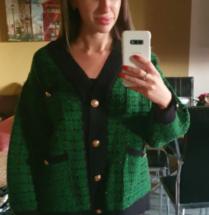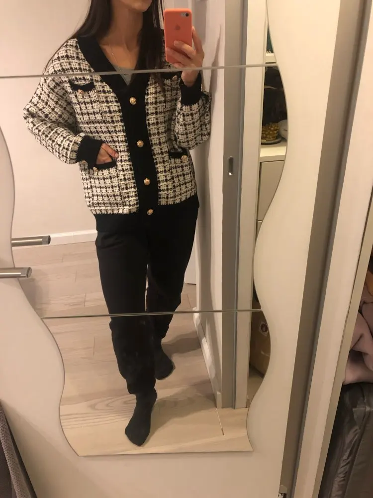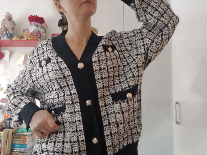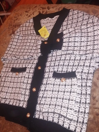 Хороший кардиган, но меньше размер заявленного, думала будет овер сайз. Немного дешевят пуговицы. Перешью на металлические .