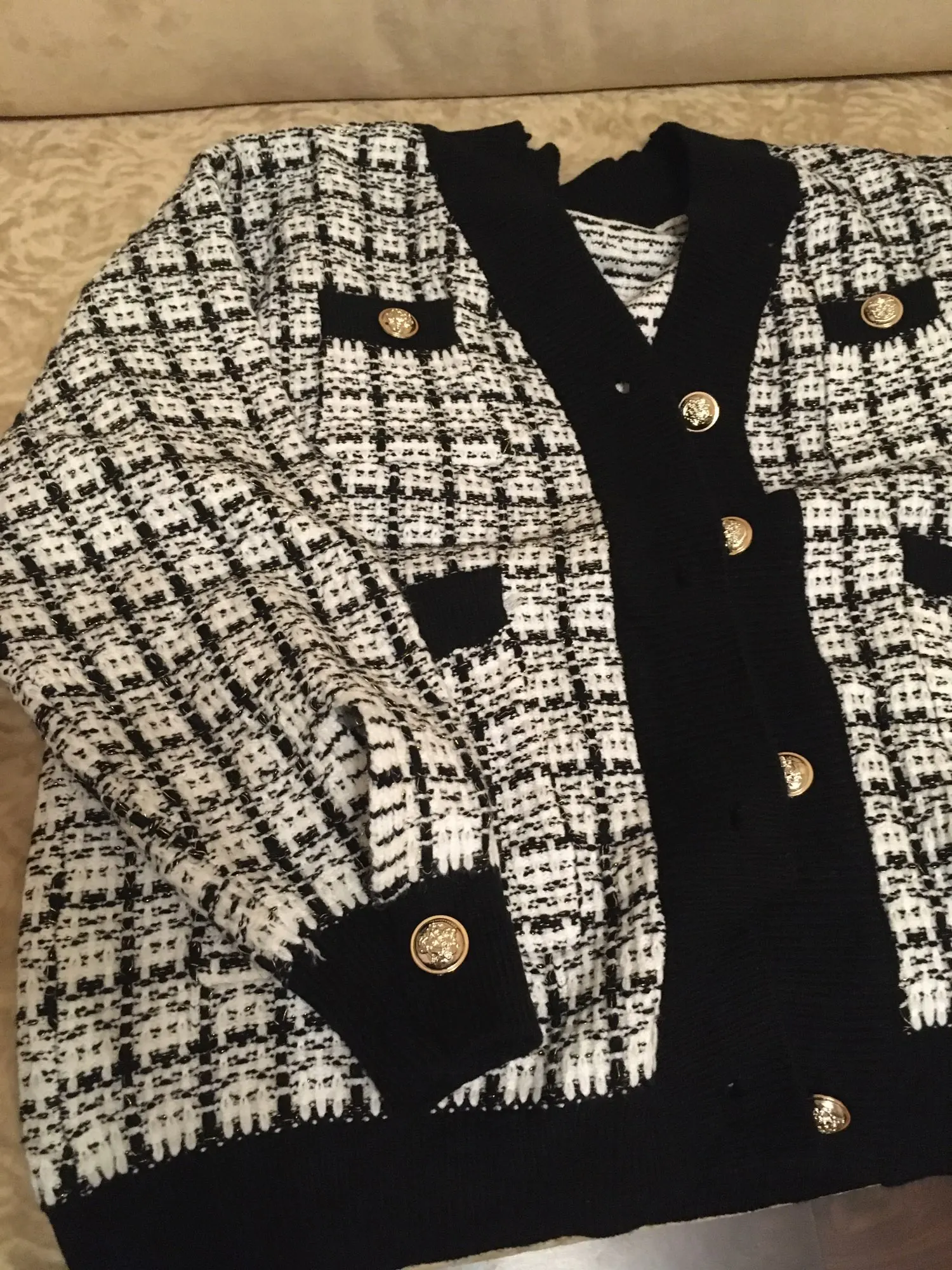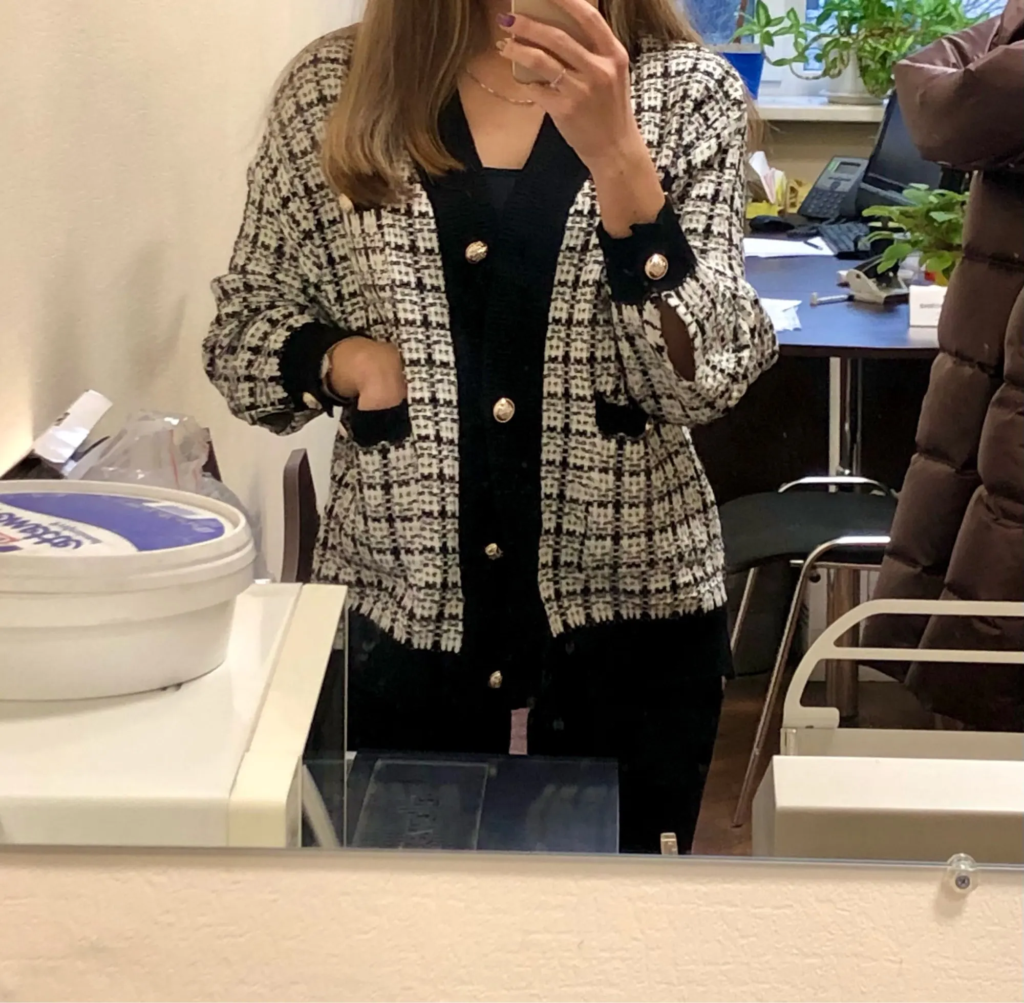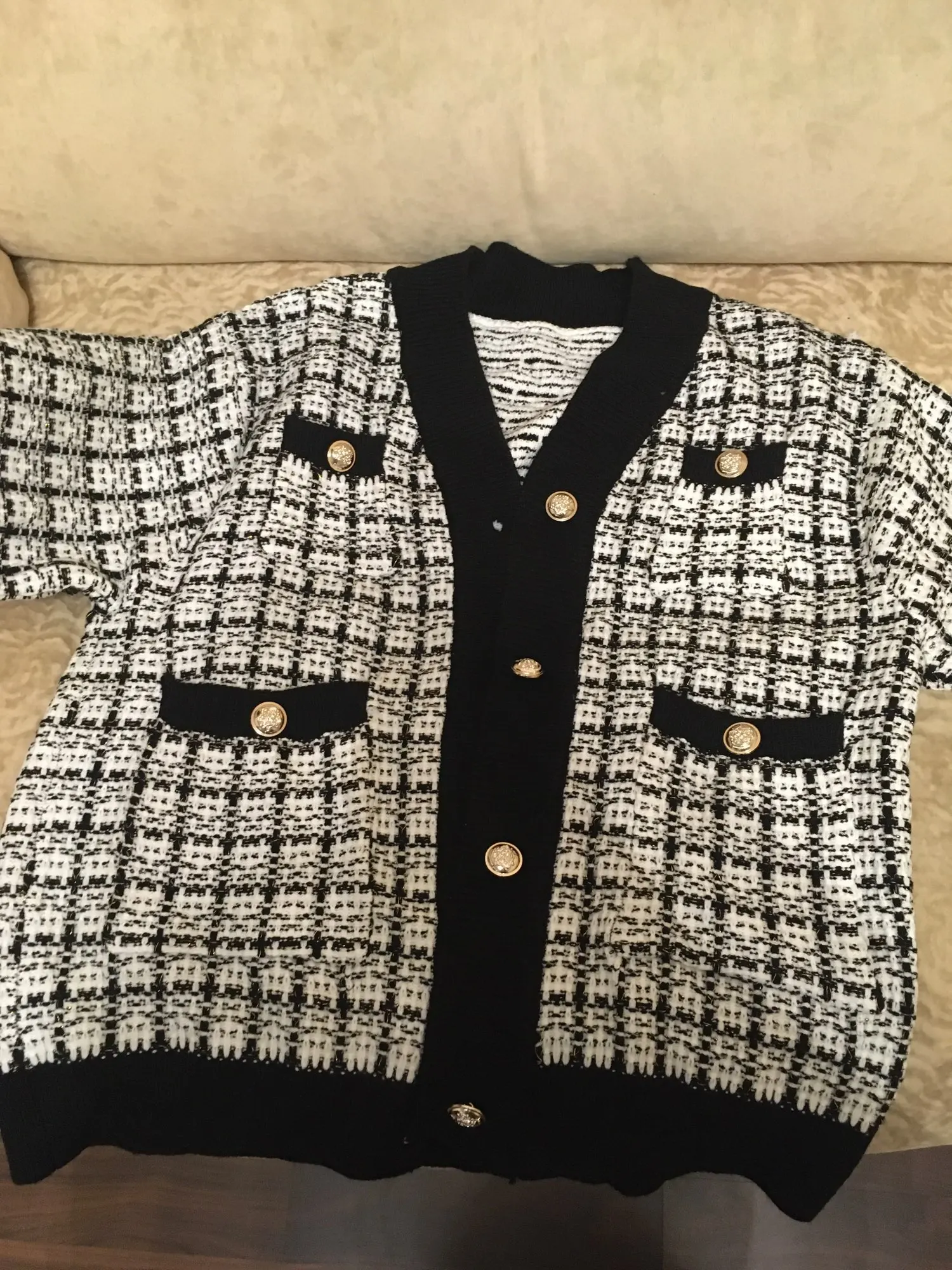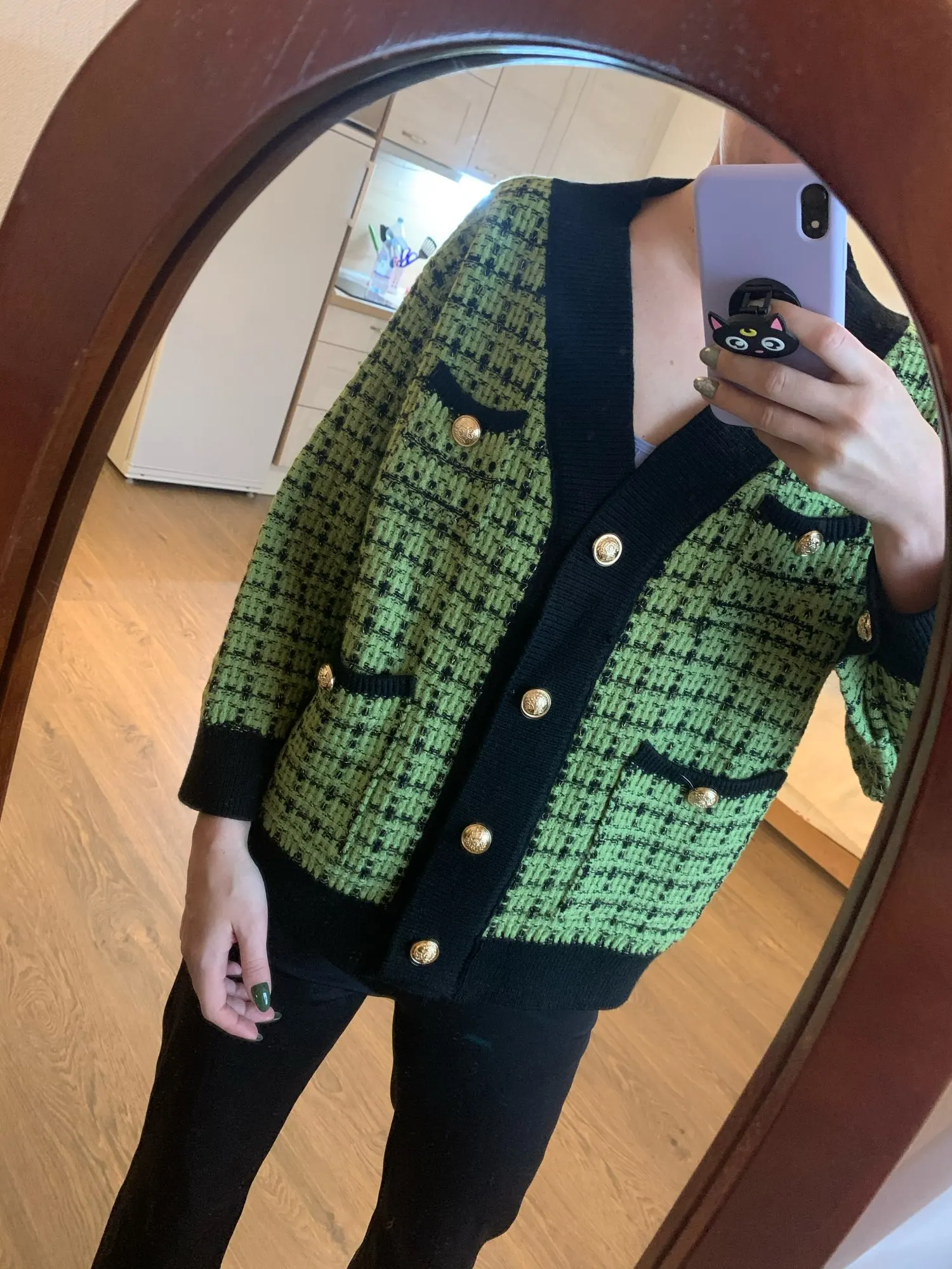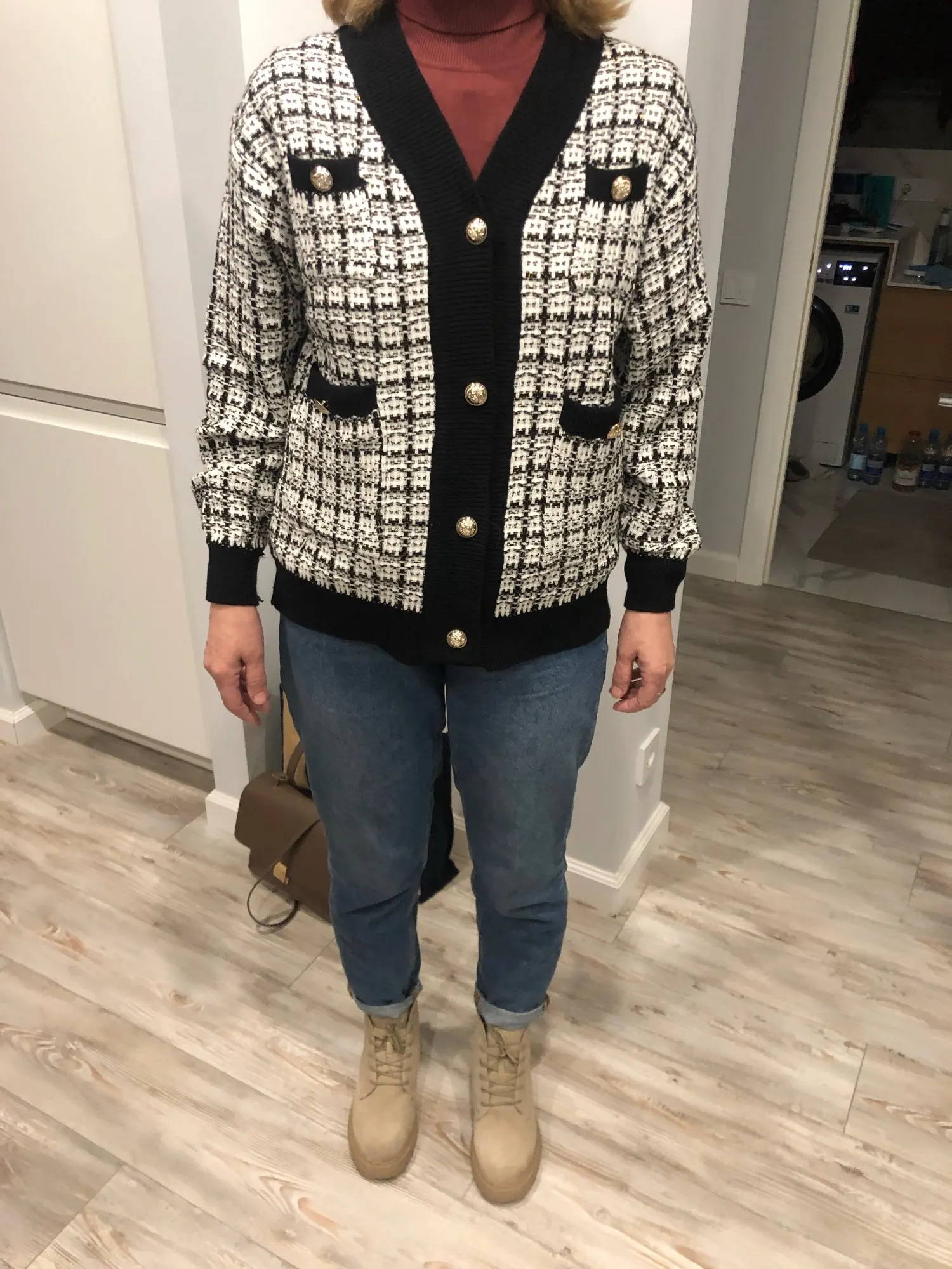 Хороший кардиган, но меньше размер заявленного, думала будет овер сайз. Немного дешевят пуговицы. Перешью на металлические .