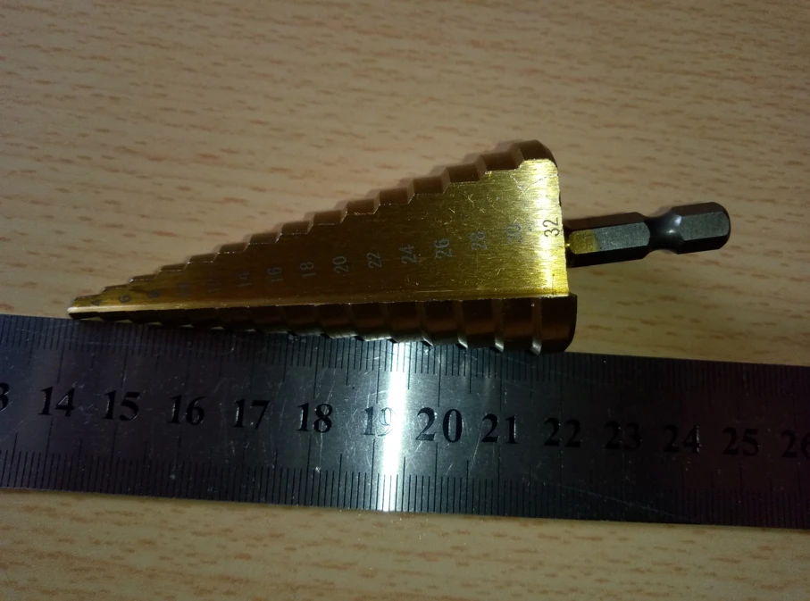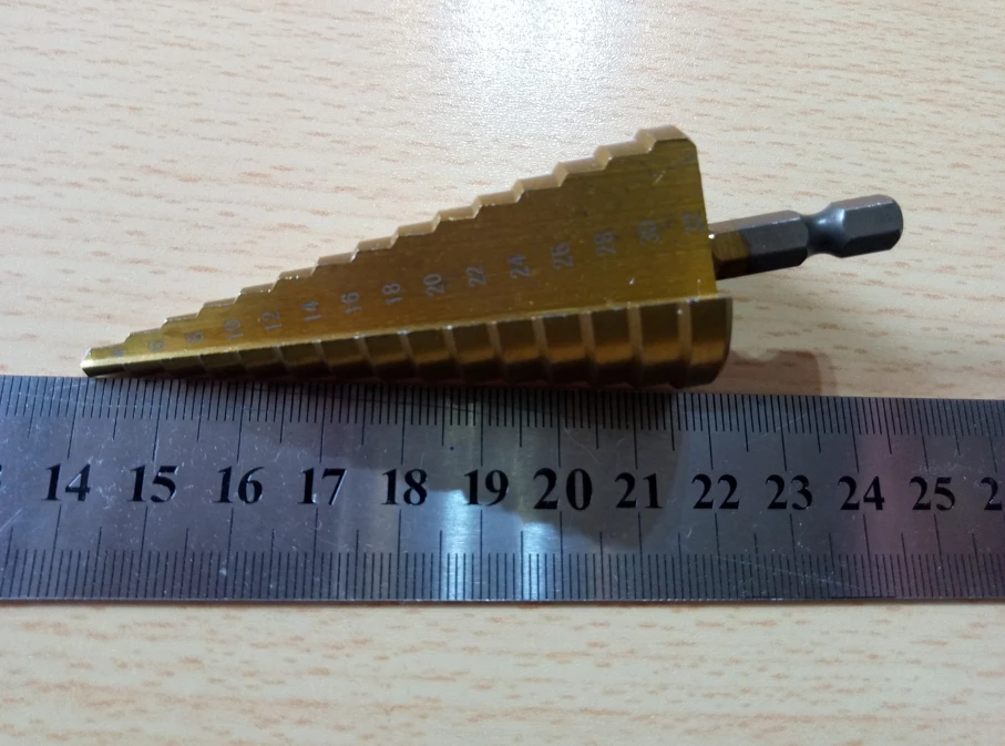 Это новая быстрорежущая сталь с большим шаговым Конусным сверлом, титановый набор сверл, который сделан из высококачественной быстрорежущей стали и с титановым покрытием, чтобы уменьшить трение и тепло