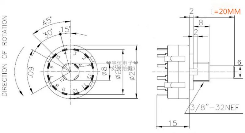 Поворотный переключатель поворотных каналов RS26, 1 полюс, 12 позиций, Длина ручки 20 мм, с ручкой, переключатель, 1 полюс