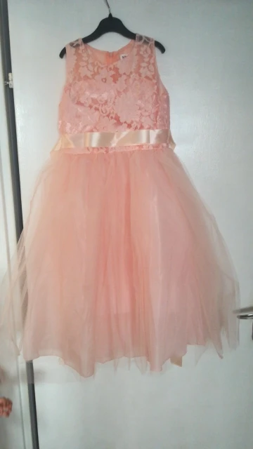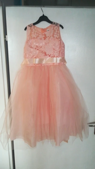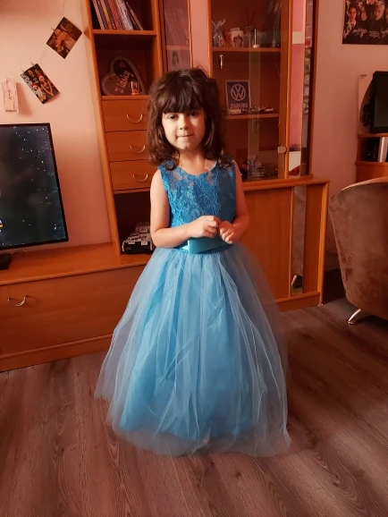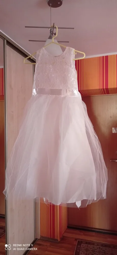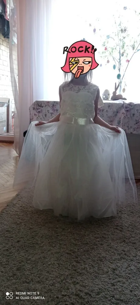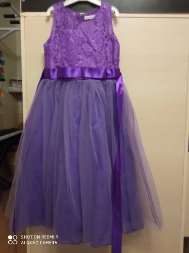 Платье красивое на картинке. Плюсы: посторонних запахов нет, после стирки не полиняло. Минусы: отгладить будет очень тяжело, подол не ровный, немного торчат нитки, подкладка из синтетики, дочь сказала, что платье колется. И оно не в пол. На пост 127 см, заказала размер 8 (140) до пола сантиметров 5-7 примерно. Продавец предложил вернуть 2$, через спор вернула половину стоимости.