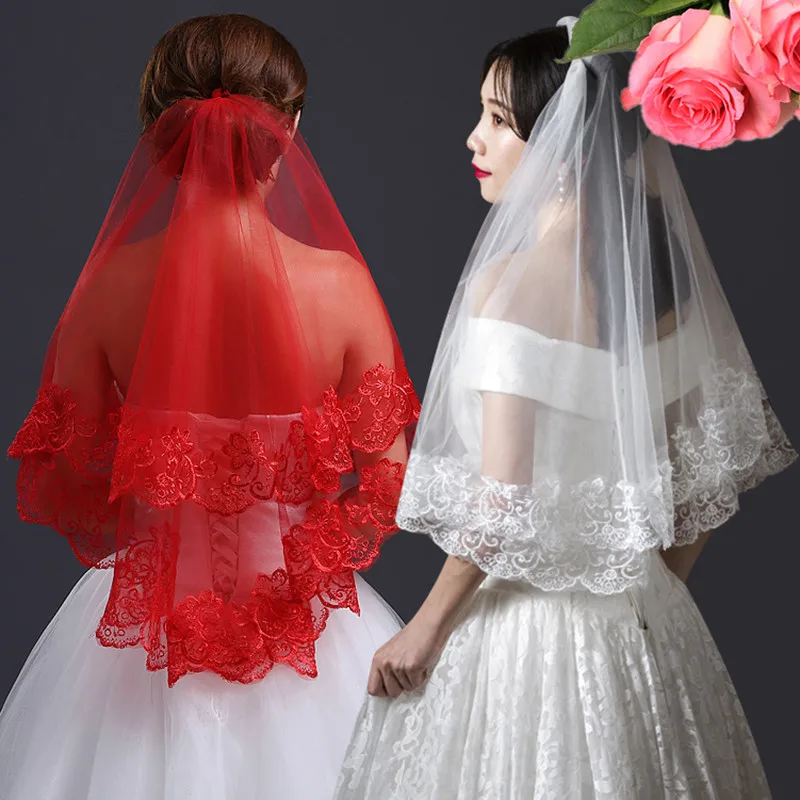 Женская короткая свадебная фата, белая Однослойная кружевная красна...