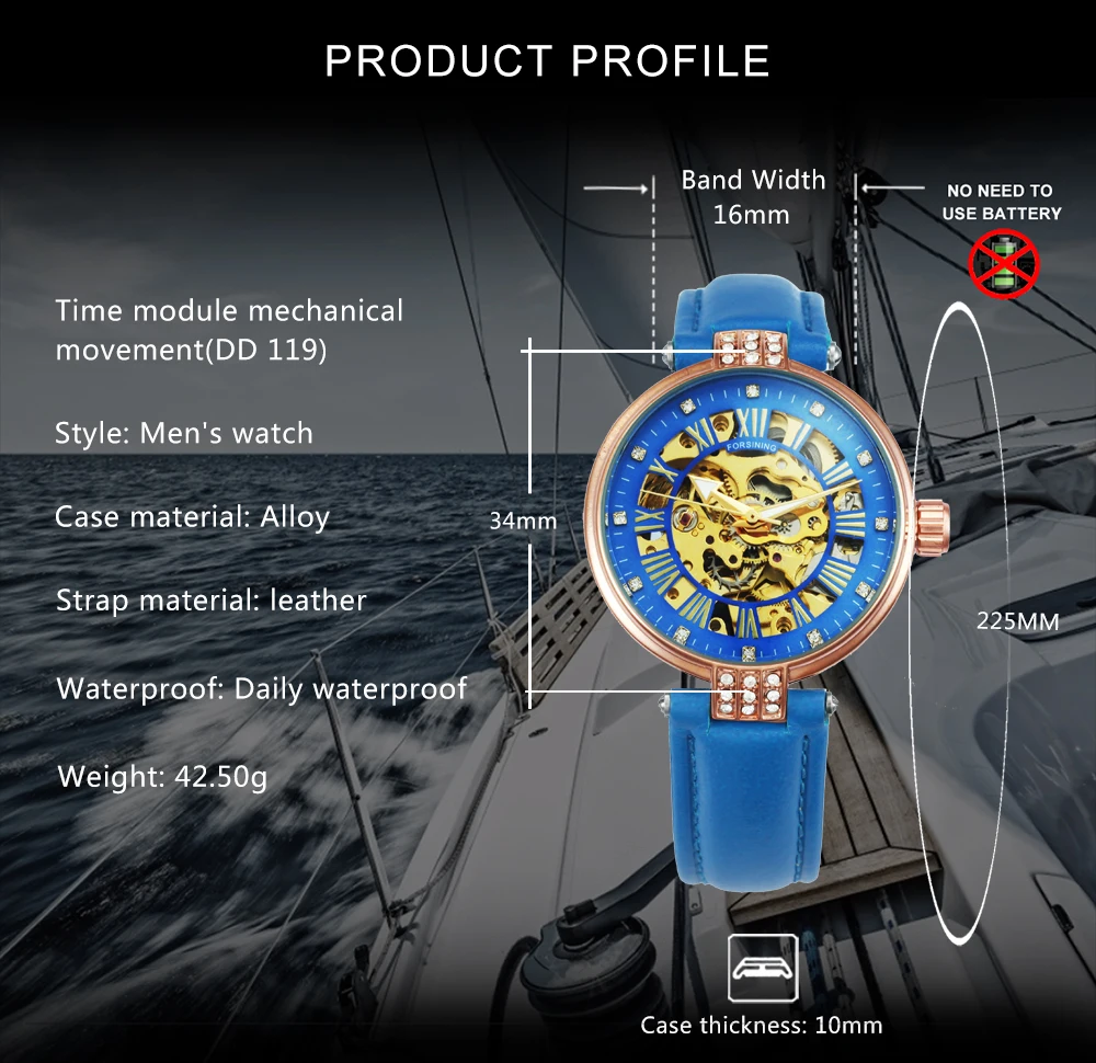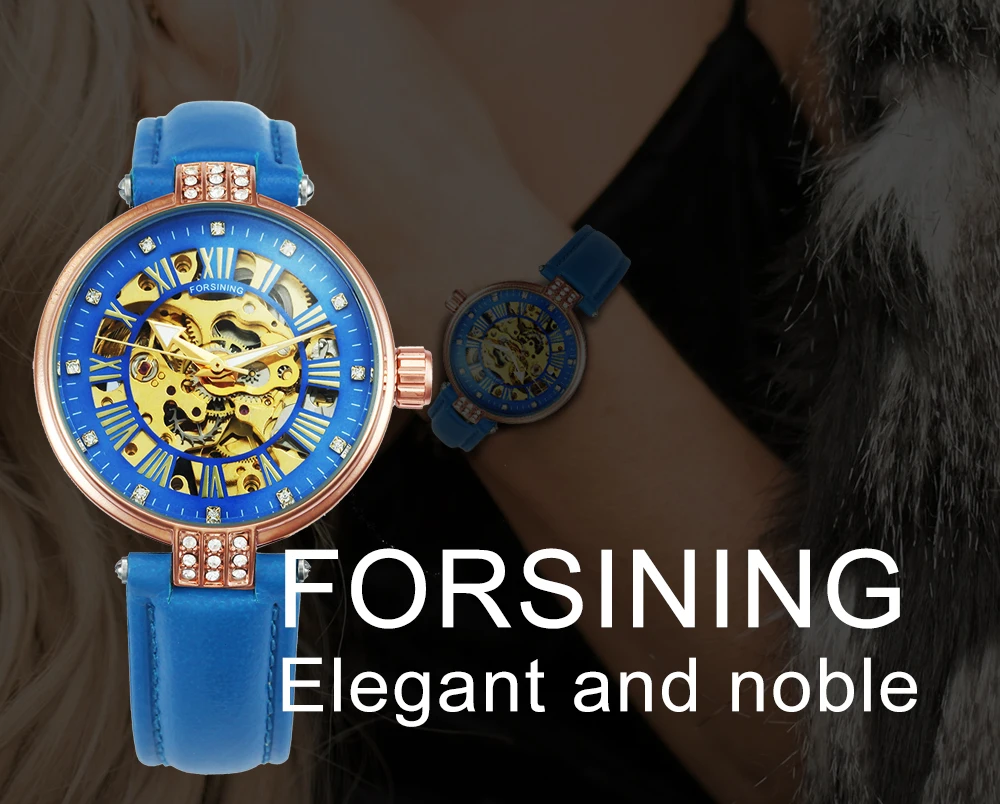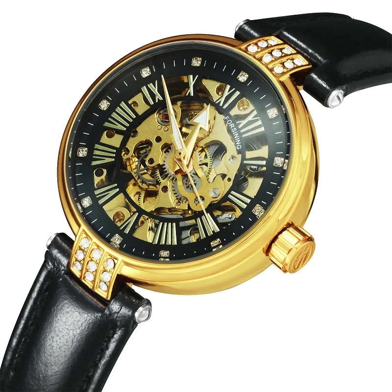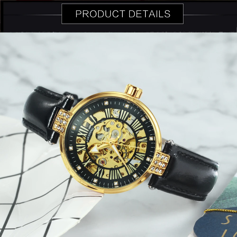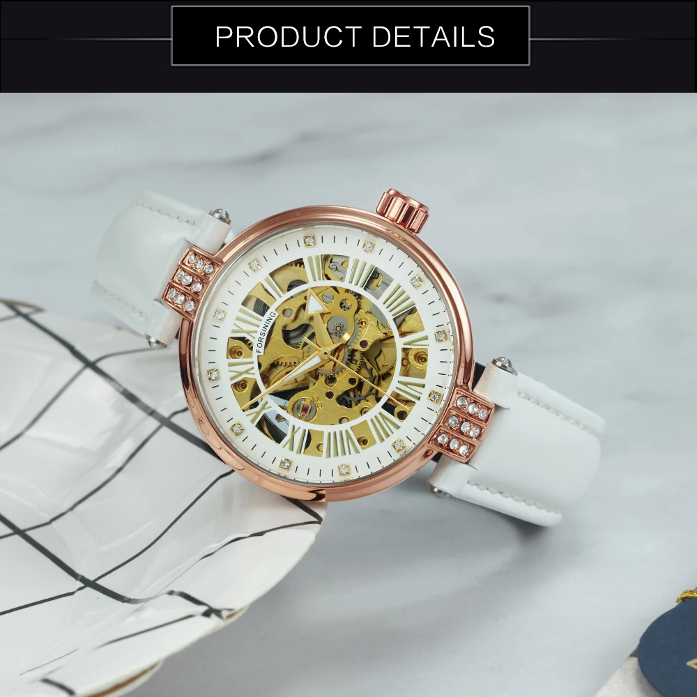 FORSINING 2019 новые женские часыБренд: FORSININGСтиль: Модный, Повседневный, деловой, роскошный, спортивныйОсновная особенность:1. Часы со стразами и ледяным дизайном, роскошный элегантный стиль2. Новые модные часы с кожаным ремешком.3. Гарантия хода на 12 месяцев.Характеристики:Диаметр циферблата: 34 ммТолщина корпуса: 10 ммДлина Часов: 225 ммШирина ремешка: 16 ммВес часов: 42,5 гМеханизм: механический с автоматическим автоподзаводом (батарея не требуется)Материал стекла: HardlexТип застежки: ПряжкаФункция: светящиеся стрелкиВодонепроницаемость: Повседневная Водонепроницаемость (не для плавания или душа)Подходящий повод:Идеально подходят для любых случаев и событий: вечеринки, годовщины, бизнес-встречи, различные виды спорта, мероприятия в помещении или ежедневное использованиеПосылка1 наручные часы (подарочные коробки не входят в стоимость)