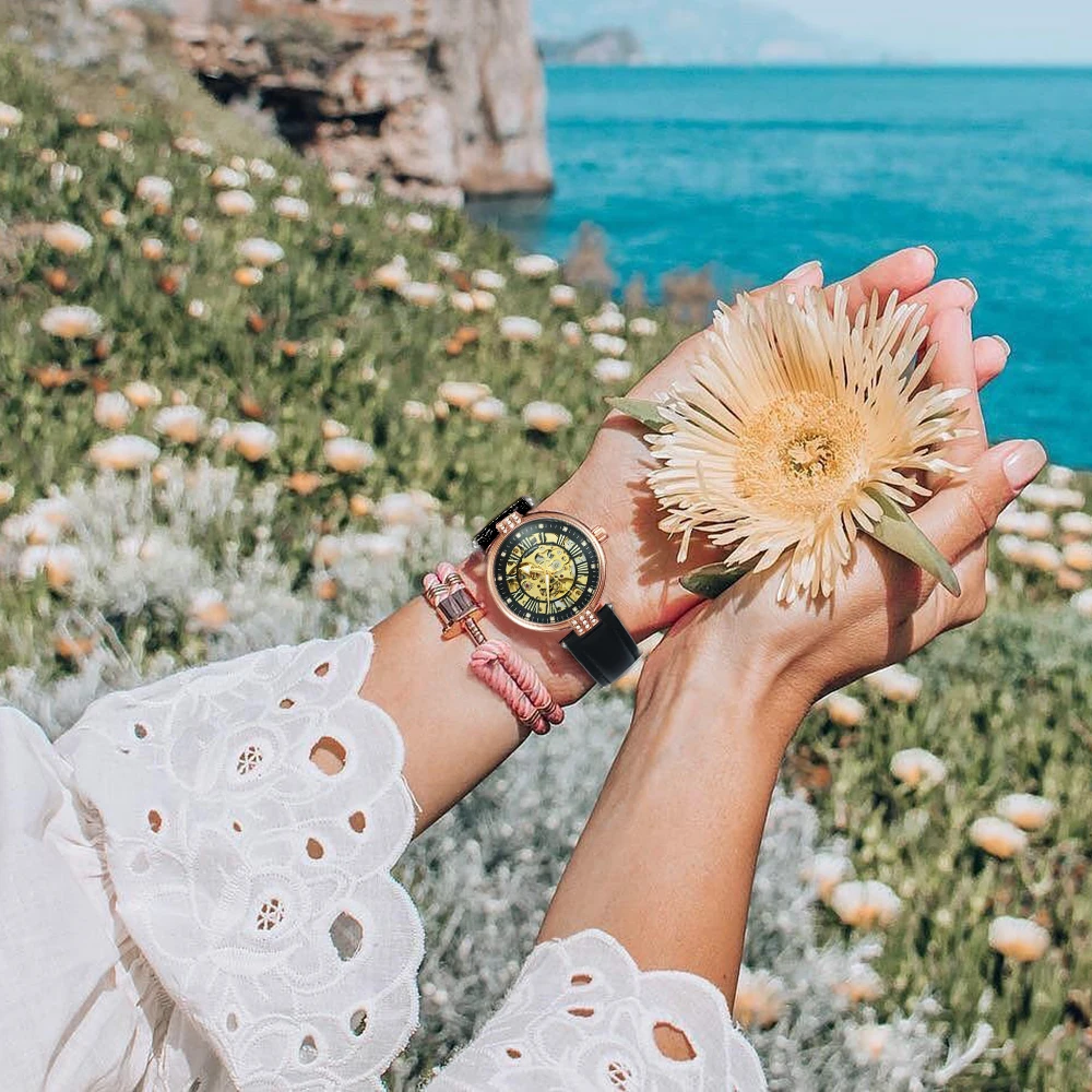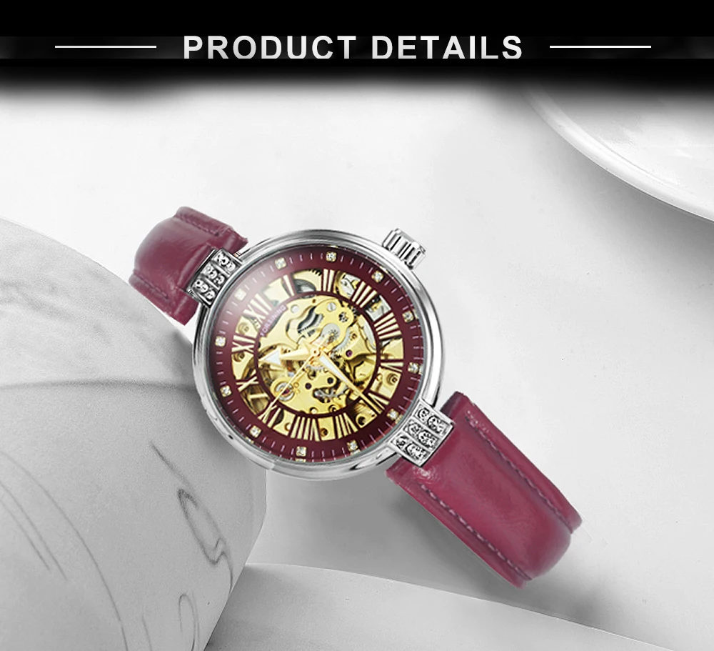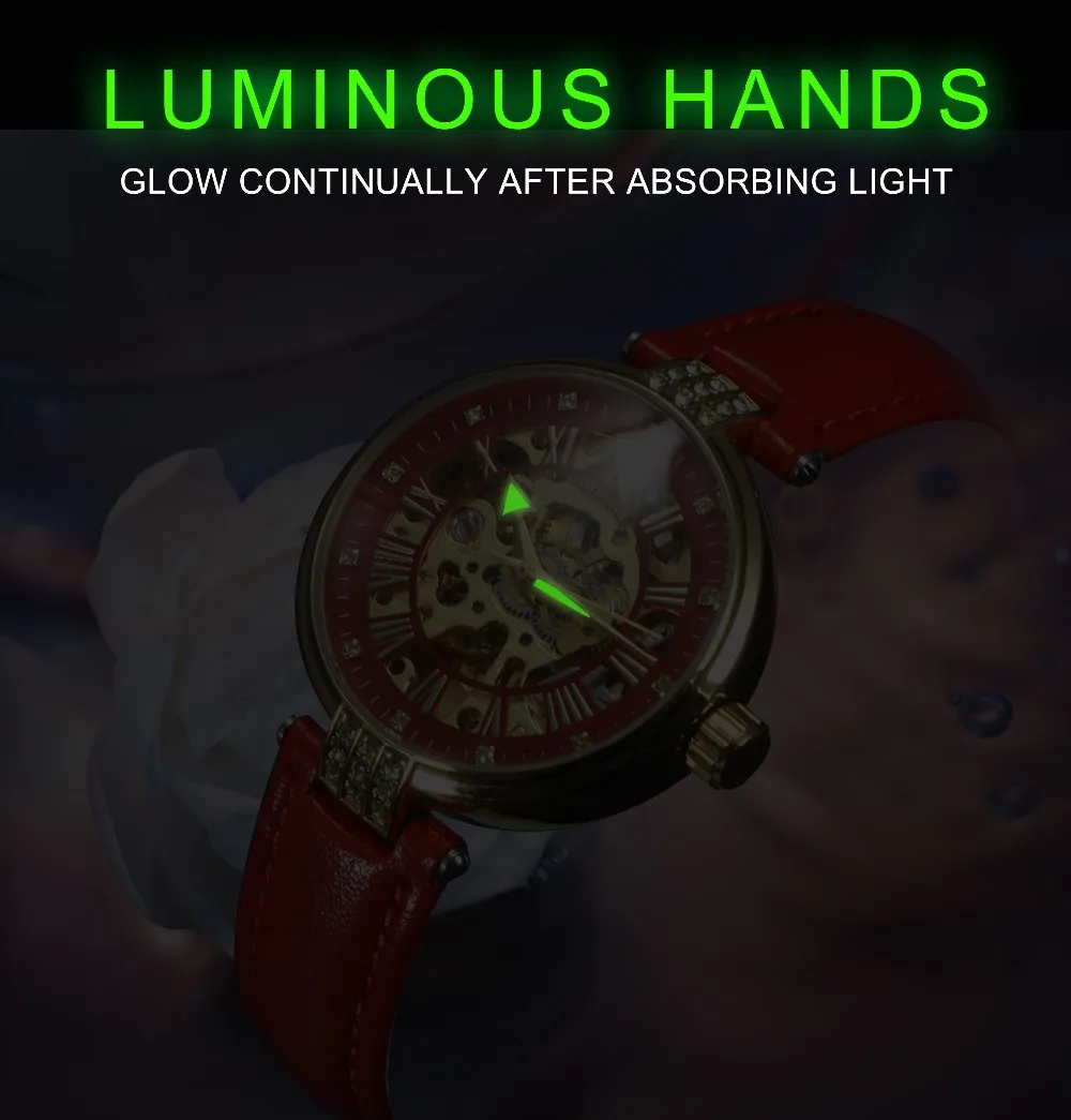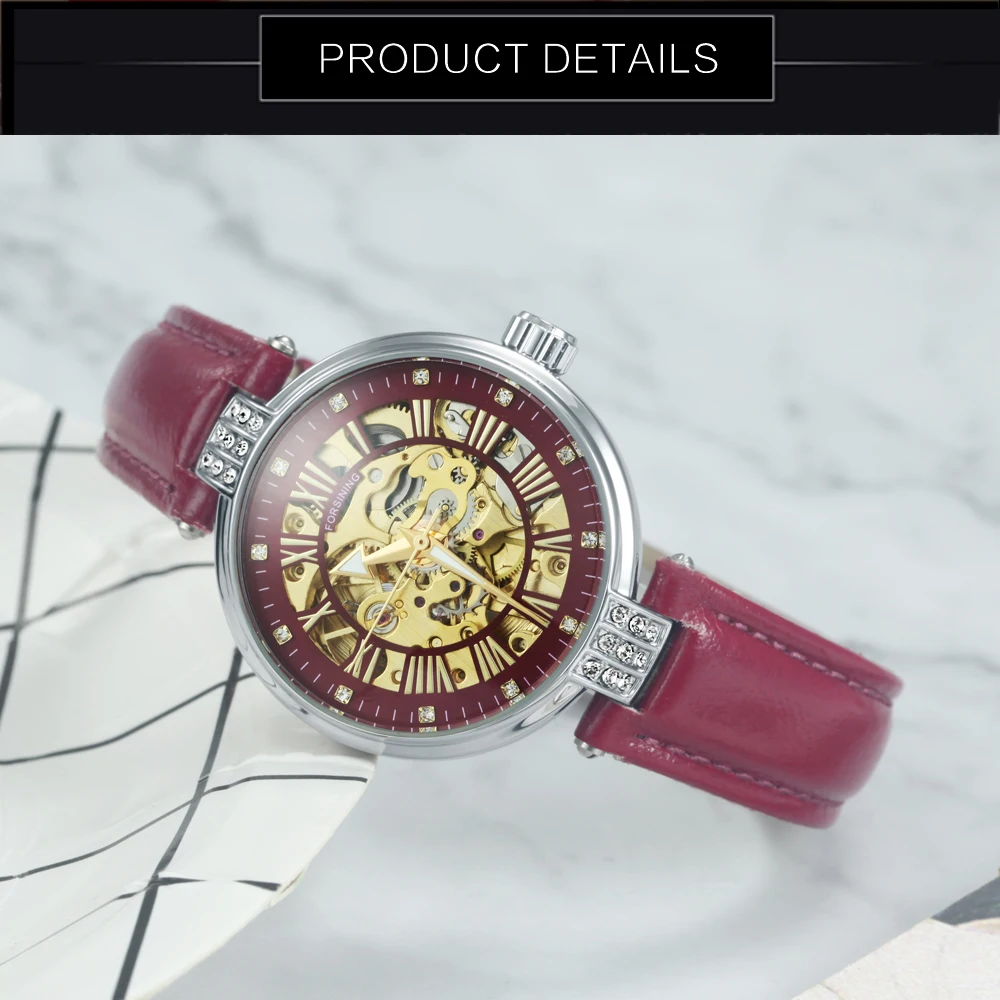 Женские Механические часы FORSINING, с красным кожаным ремешком, со скелетоновым циферблатом, со стразами, 2020