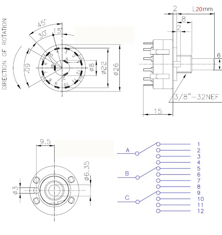 5 шт., 3-полюсный 4-позиционный переключатель RS26, Длина ручки 20 мм