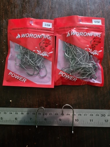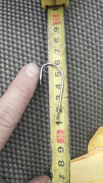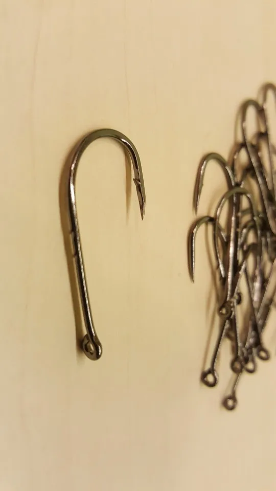 Большие крючки с кольцом на крупную рыбу. Проволока довольно толстая. Есть небольшие зацепы для приманки на цевье.