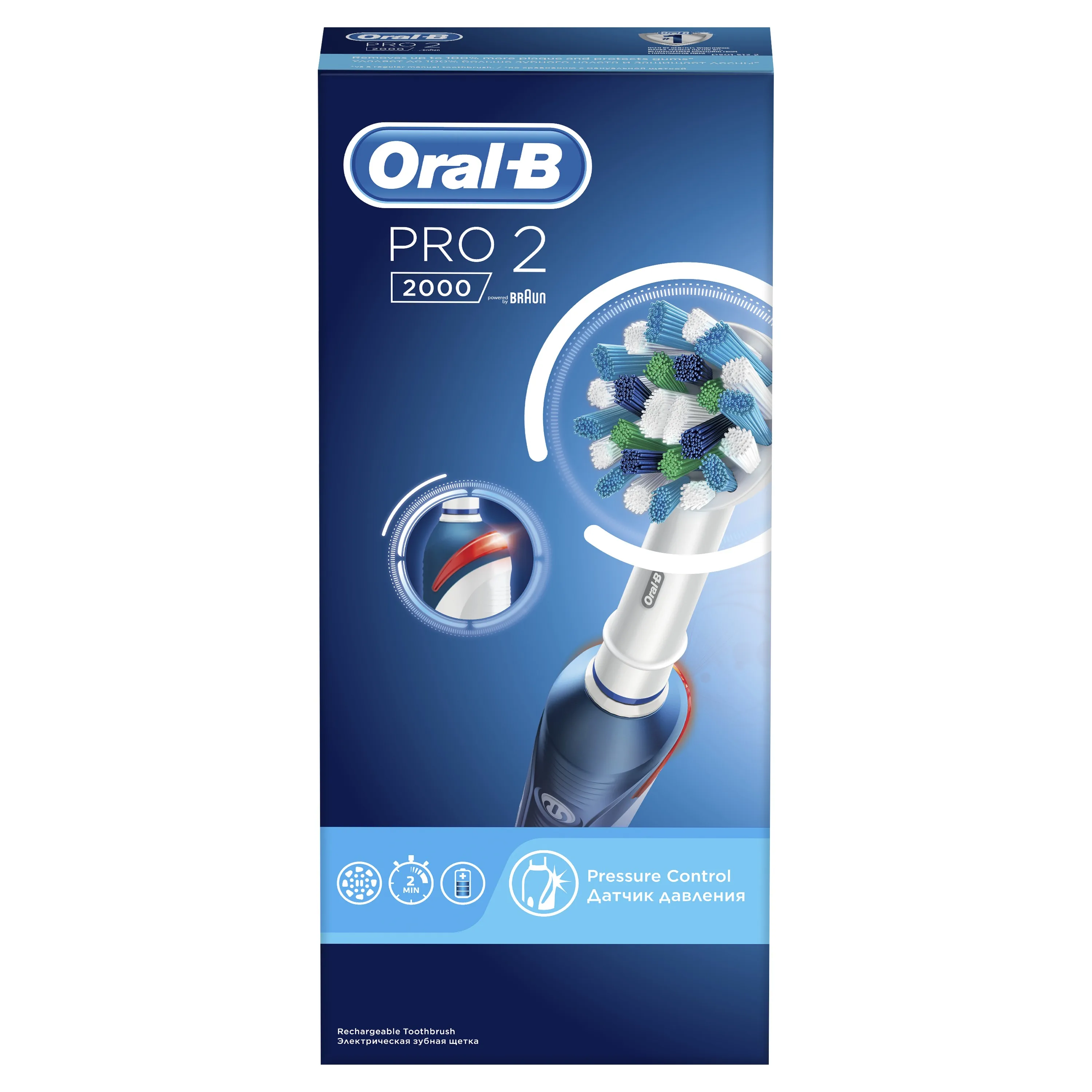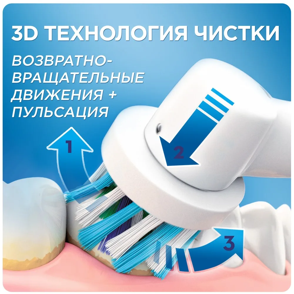 Электрическая зубная щетка Oral-B PRO 2 2000 удаляет до двух раз больше зубного налета, чем мануальная зубная щетка. 2 режима чистки обеспечивают комплекcный уход. 'Ежедневная чистка' обеспечивает превосходное очищение полости рта, а режим 'Уход за деснами' массирует десны, улучшая их состояние. Благодаря профессионально разработанному дизайну насадки CrossAction, щетинки, расположенные под углом, окружают каждый зуб, бережно удаляя налет даже из труднодоступных мест и вдоль линии десны. Комплектация: аккумуляторная электрическая зубная щетка с 2 режимами чистки (1 шт.), сменная насадка CrossAction (1 шт.), зарядное устройство (1 шт.) Более мощный мотор d501: 8800 возвратно-вращательных движений + 40000 пульсирующих движений. Подходит для детей с 3-х лет. Перейдите на новый уровень чистки за 2 минуты!. Удаляет на 100% больше зубного налета, чем мануальная зубная щетка, а также улучшает состояние десен. Визуальный датчик давления не только автоматически отключает пульсацию, но и загорается красным, помогая привыкнуть к правильной технике чистки. Закругленные кончини щетинок защищают эмаль. Водонепроницаемая эргономичная ручка и индукционное зарядное устройство, безопасное для использования в ванной комнате. Oral-B - марка зубных щеток No1, используемая большинством стоматологов мира!* (* на основании международных опросов P&G среди репрезентативной выборки стоматологов, проводимых регулярно, в т.ч. 2013-2015 гг.). Гарантия результата или возврат денег (Испытайте в действии зубную щетку Oral-B в течение 30 дней. Если вы не будете на 100% удовлетворены результатом, Oral-B вернет деньги. Подробная информация vk.com/insmiles и everydayme.ru/teg/oral-b ). 3D технология чистки совмещает возвратно-вращательные движения с пульсацией: пульсирующие движения бережно разрыхляют зубной налет, а возвратно-вращательные движения выметают его и массируют десны. Голубые щетинки Indicator обесцвечиваются наполовину, сигнализируя о необходимости замены насадки. Регулярно меняйте насадку, чтобы постоянно получать превосходный результат (менять насадку рекомендуется в среднем раз в 3 месяца.). Разработано со стоматологами. Сделано в Германии.