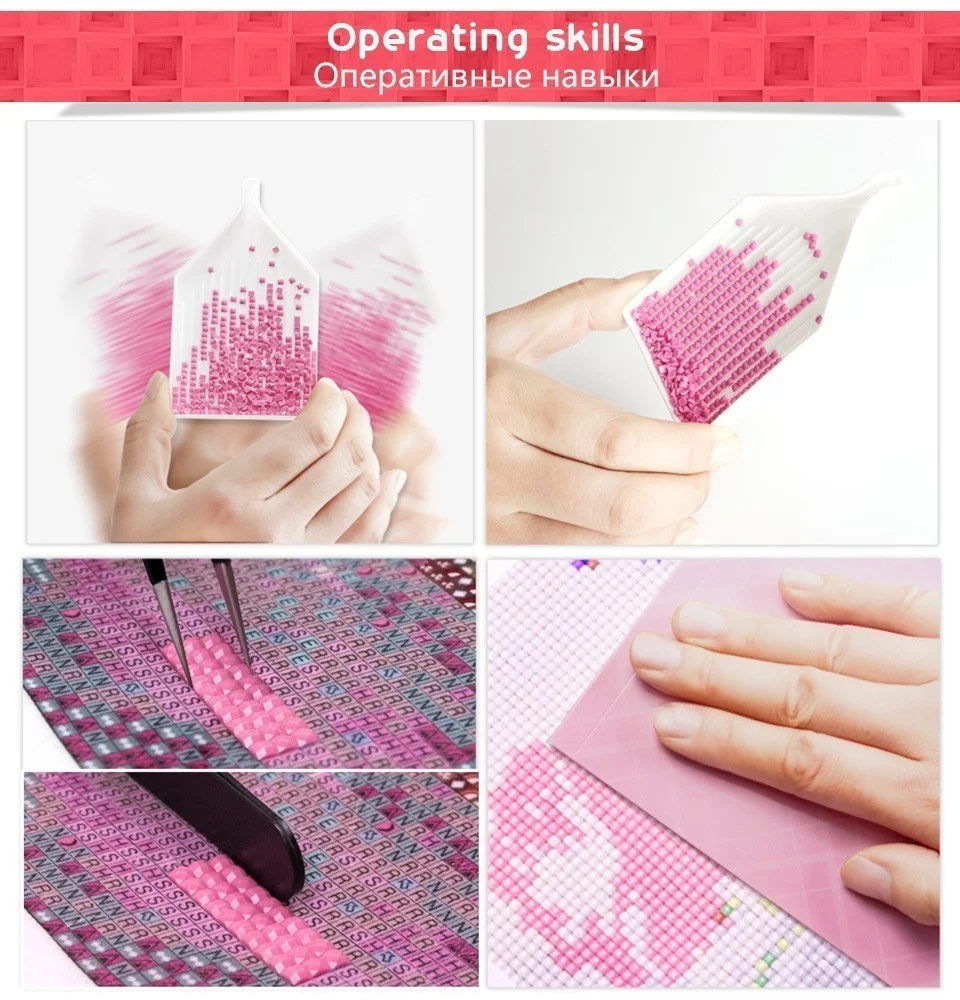 Инструменты включают в себя: алмазную пластину, клей, пинцет, ручки (наклеить 10 бриллиантов одновременно)