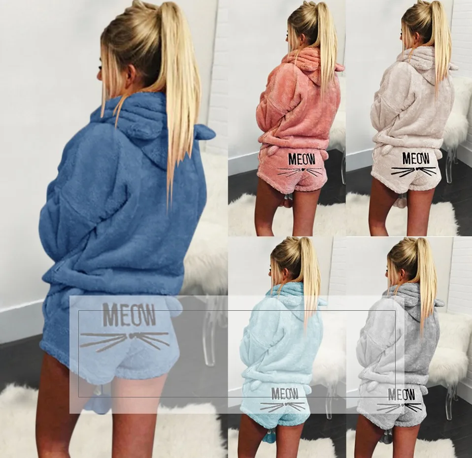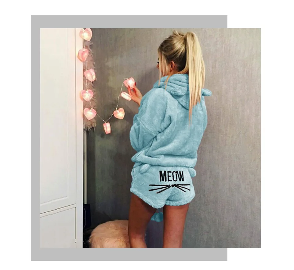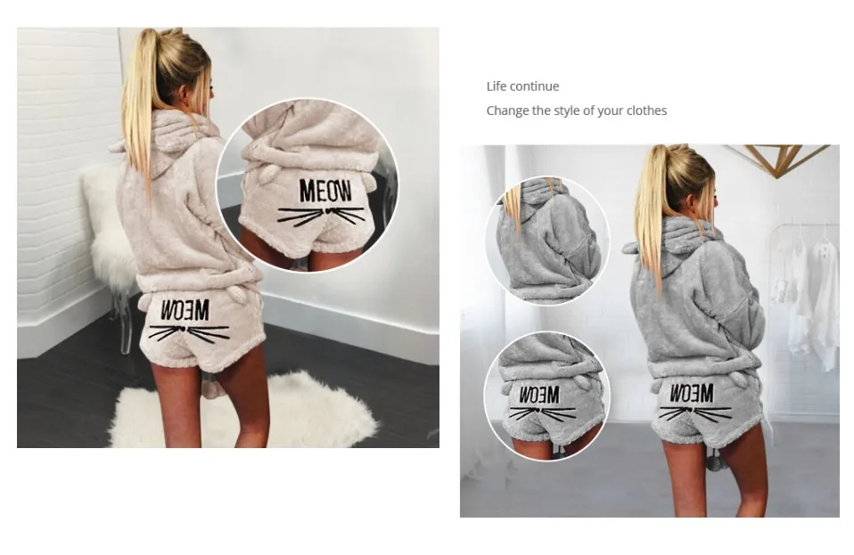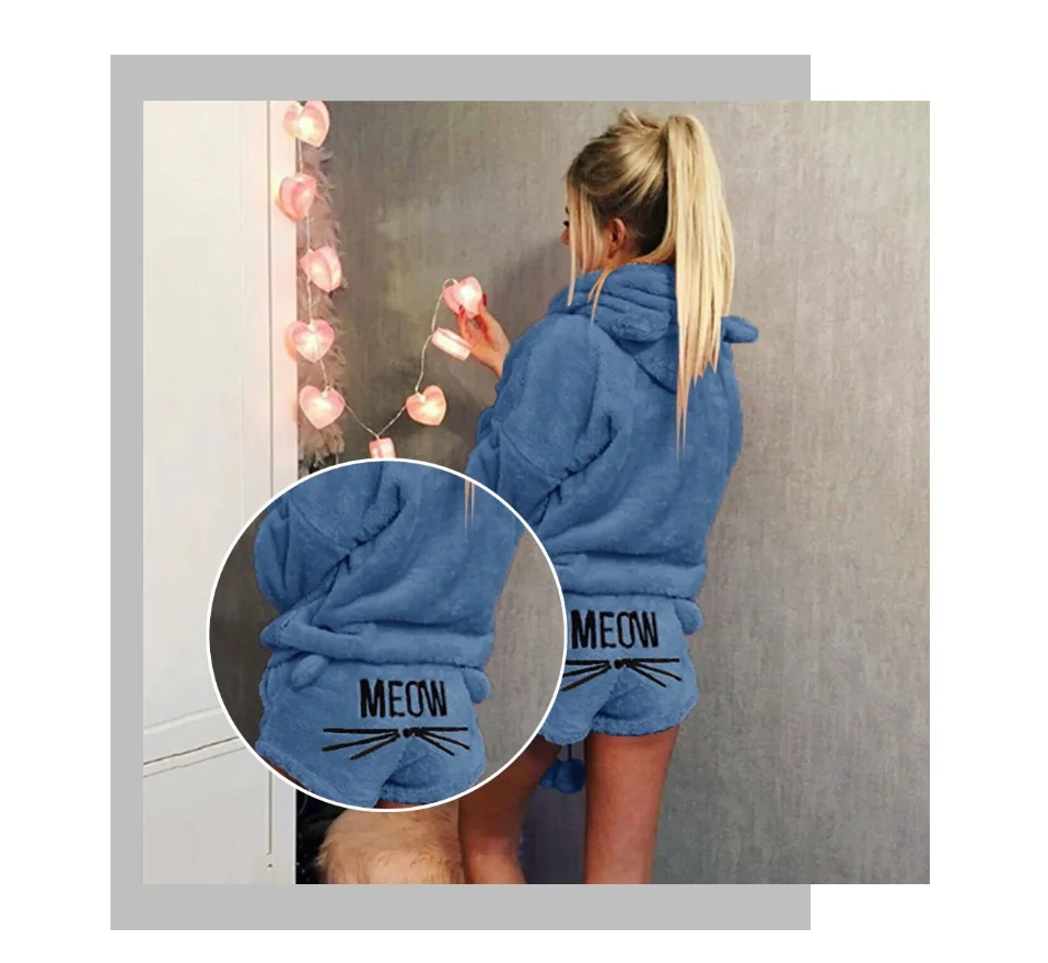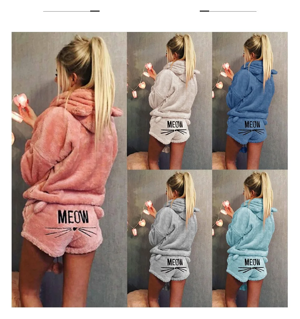 Женские бархатные пижамные комплекты кораллового цвета, осенне-зимняя теплая Пижама, комплект из двух предметов, одежда для сна, милые толстовки с капюшоном и шорты с надписью Meow, домашняя одежда