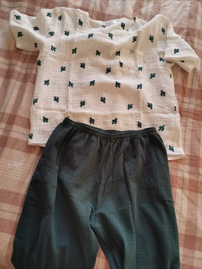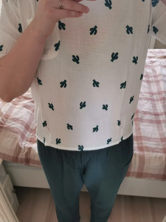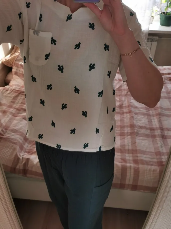 Пижамка очень понравилась!!!Абсолютно соответствует фото.Отличная вещичка.Правда,я брала её для работы.Во время ковида -одевать под СИЗ.Прекрасно впитывает пот,так как сшита из тонюсенькой марлевки.В этом случае прекрасная замена медицинскому костюму.)В спокойные свободные времена буду носить на даче летом).