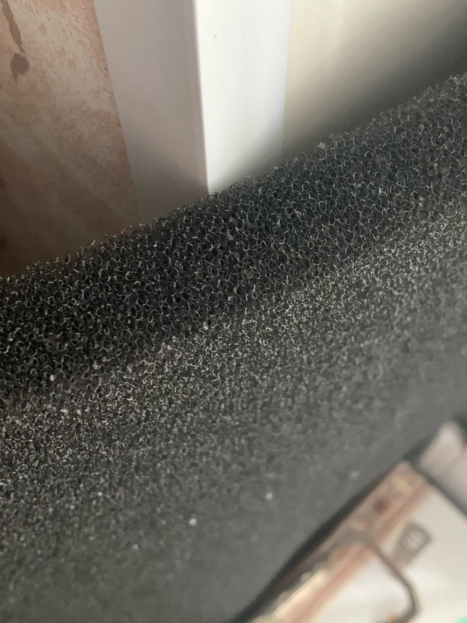 Качество материала хорошее, запаха нет. Размер меньше заявленного (мне пришел отрез 47см х 48см) для кого это важно, имейте ввиду. Размер пор достаточно крупный, чтобы лучше понять их размер, смотрите фотографию фильтра на просвет.