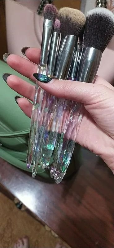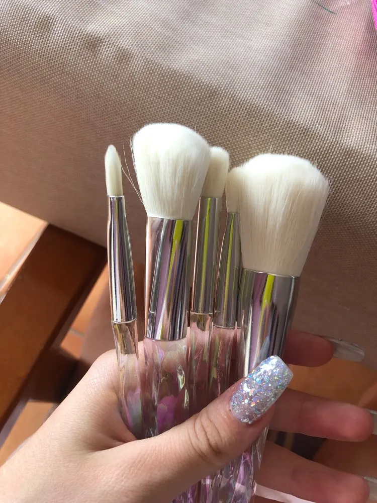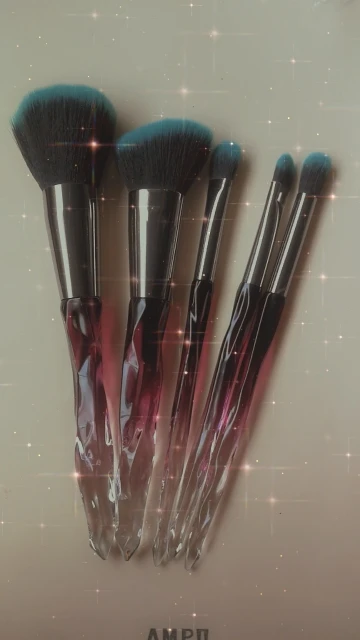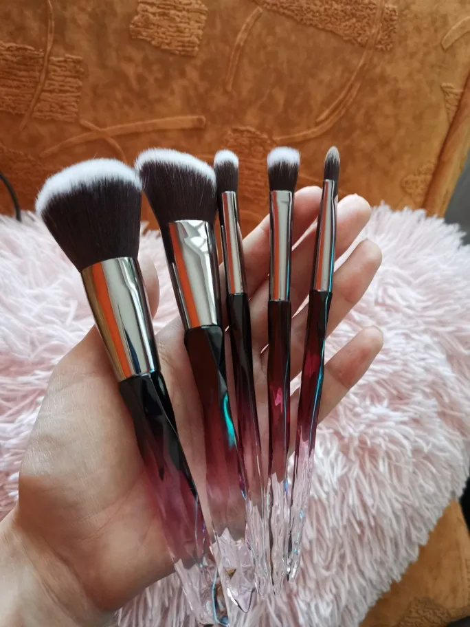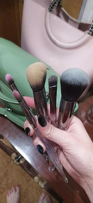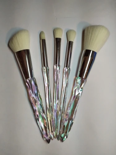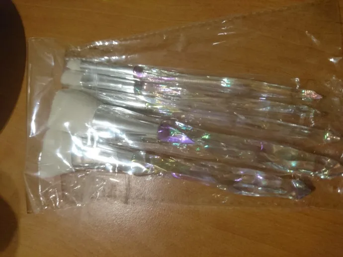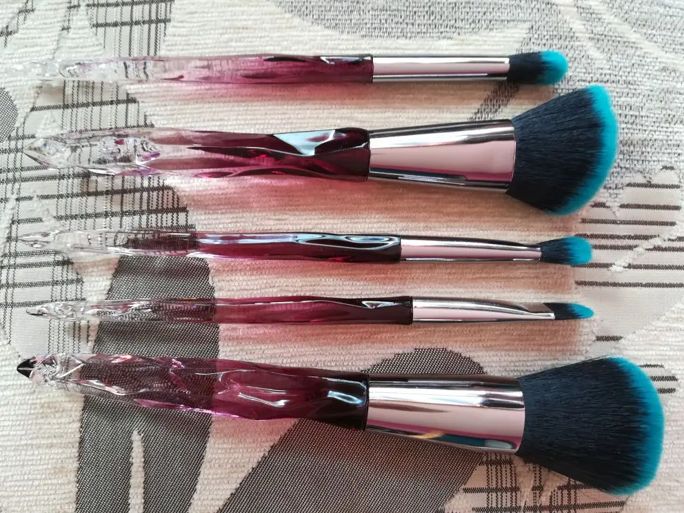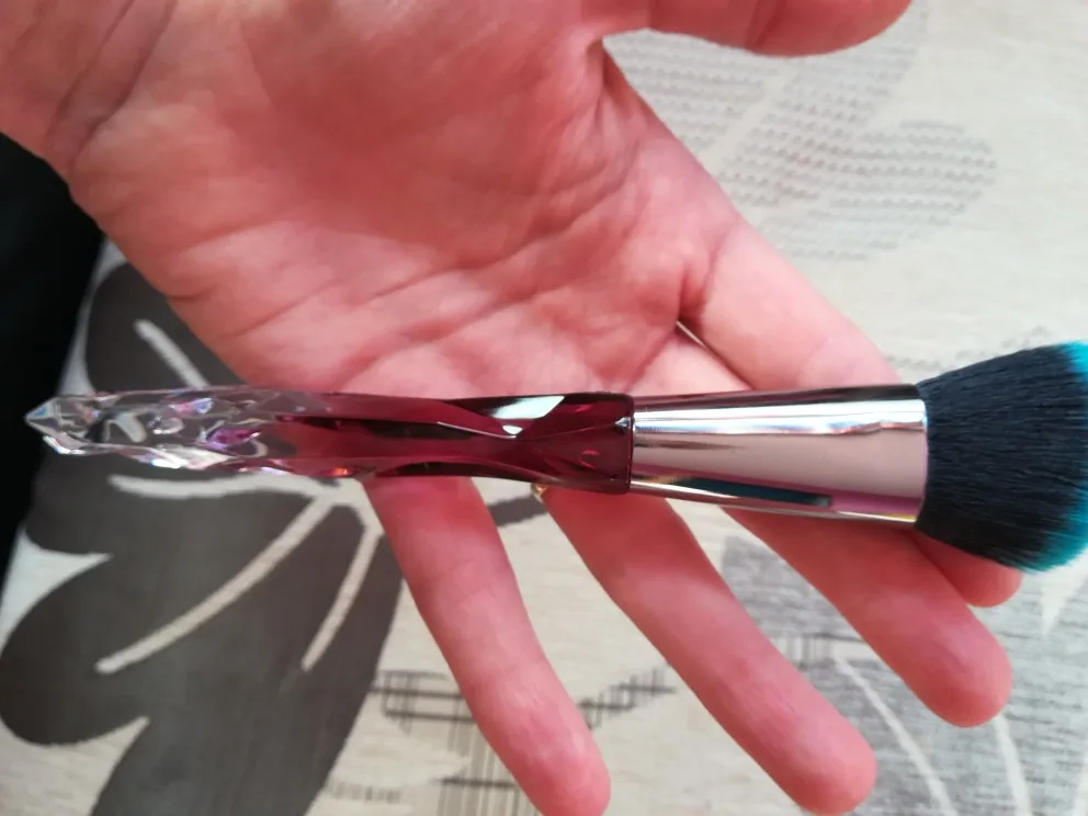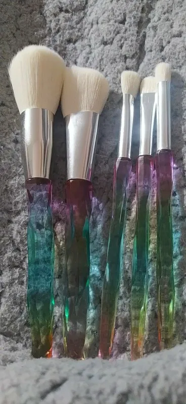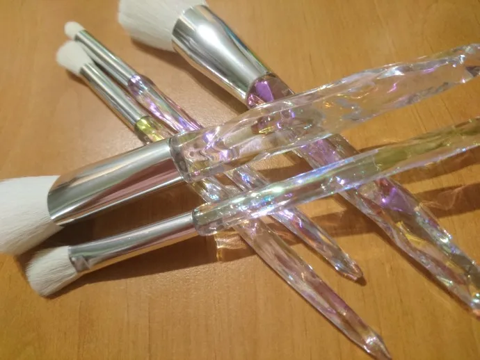 Кисти пришли за месяц. Думала что ручка будет прозрачной, но нет, на ней матовое покрытие((( цвет конечно красивый, и материал приятный на ощупь, но думаю что быстро эта красота затрется (проблема всех матовых покрытий). Покупала весь набор только из-за скошенной кисти, но она оказалась криво острижена. Неприятно. В целом кисти вроде ничего, мягкие, приятные, но погрешности ввиде торчащих волосков все-же есть.