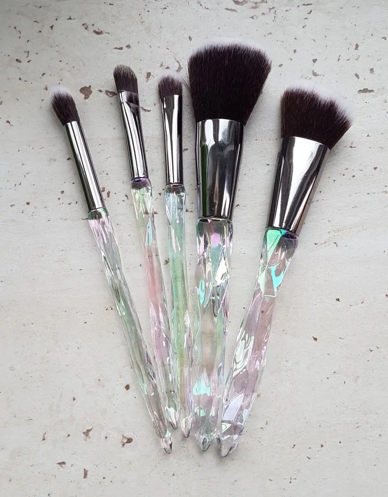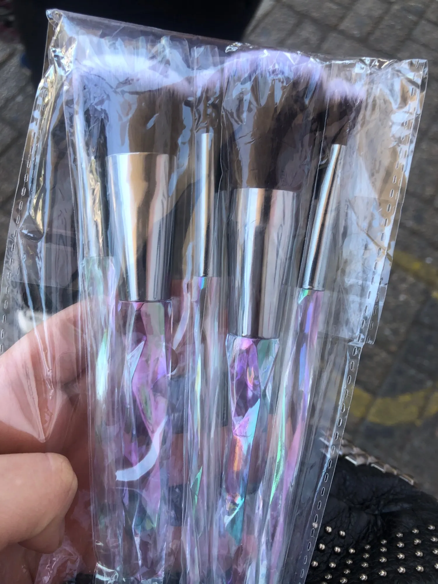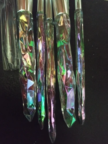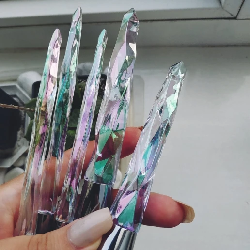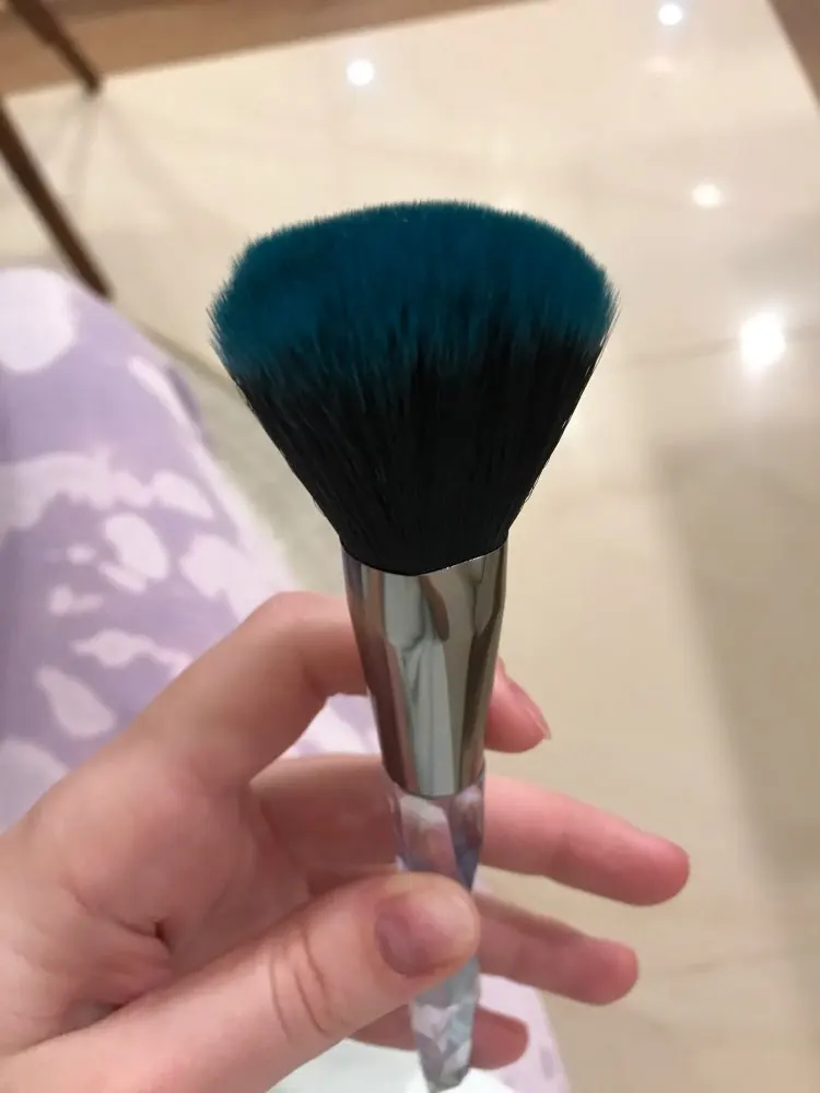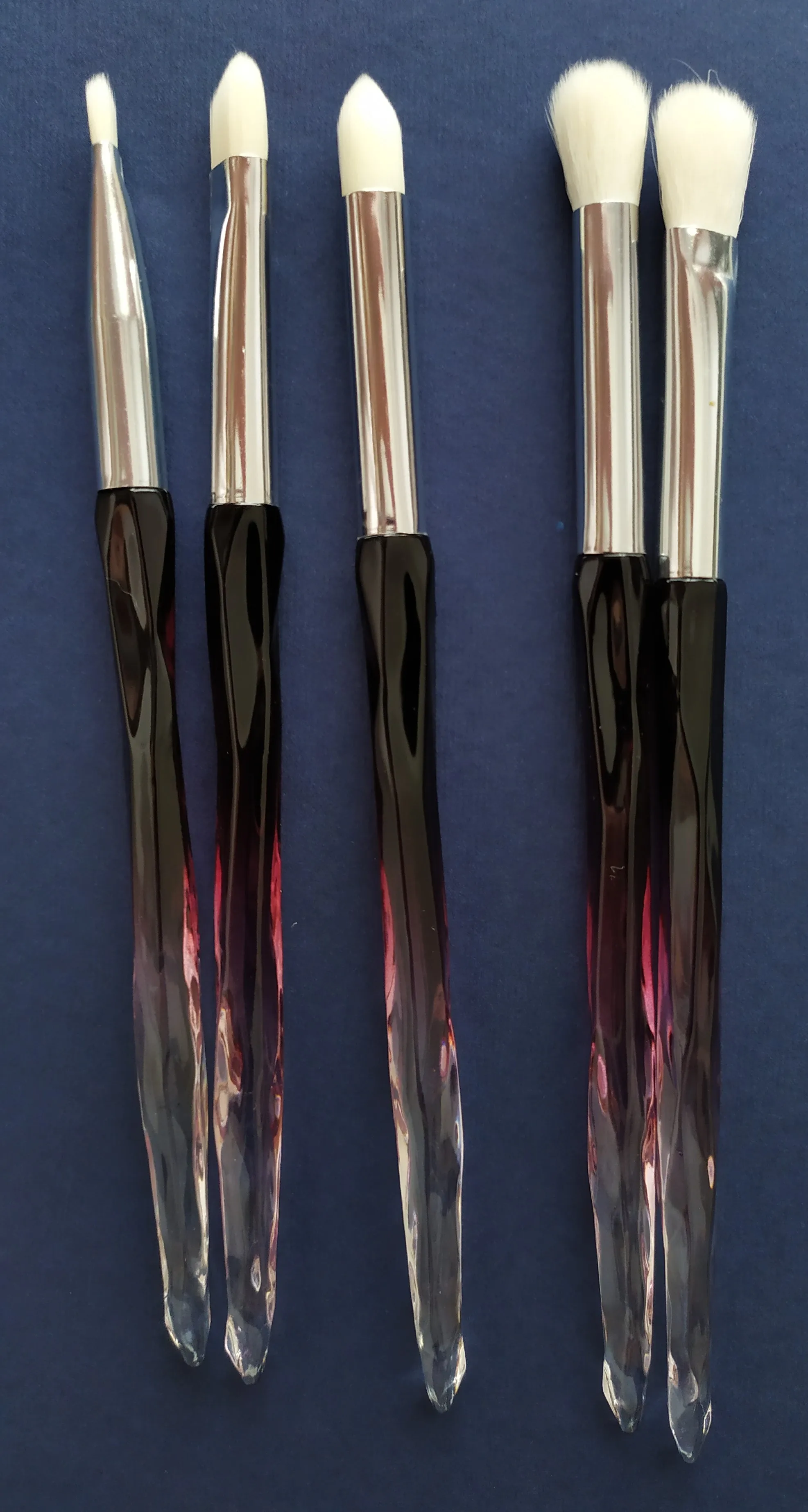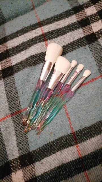 Кисти пришли за месяц. Думала что ручка будет прозрачной, но нет, на ней матовое покрытие((( цвет конечно красивый, и материал приятный на ощупь, но думаю что быстро эта красота затрется (проблема всех матовых покрытий). Покупала весь набор только из-за скошенной кисти, но она оказалась криво острижена. Неприятно. В целом кисти вроде ничего, мягкие, приятные, но погрешности ввиде торчащих волосков все-же есть.