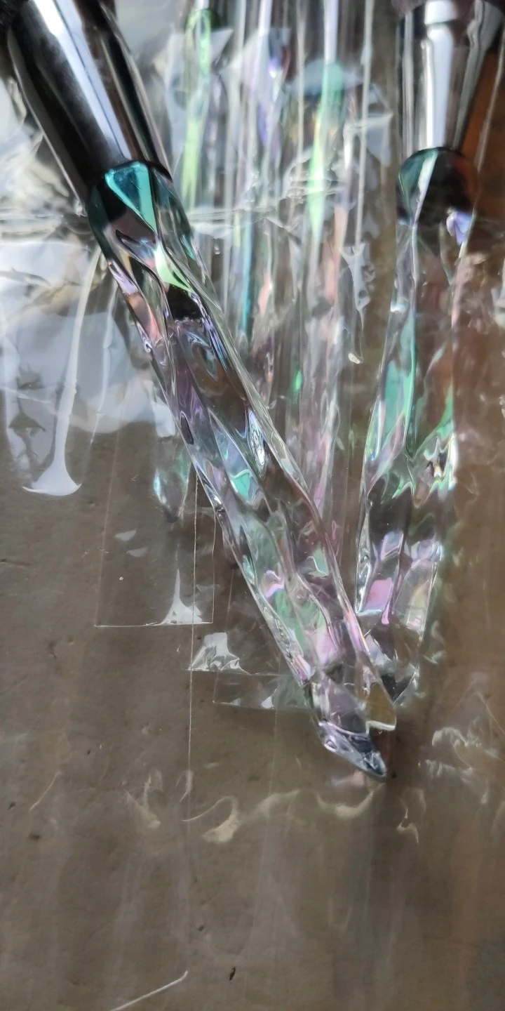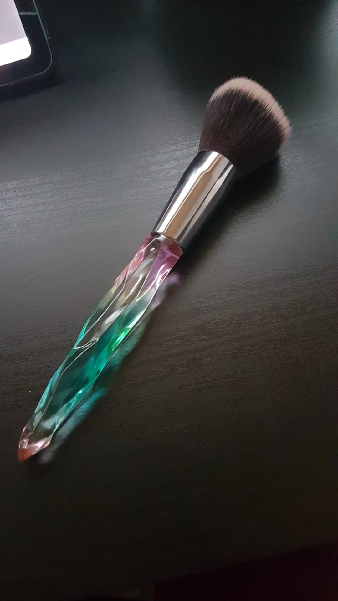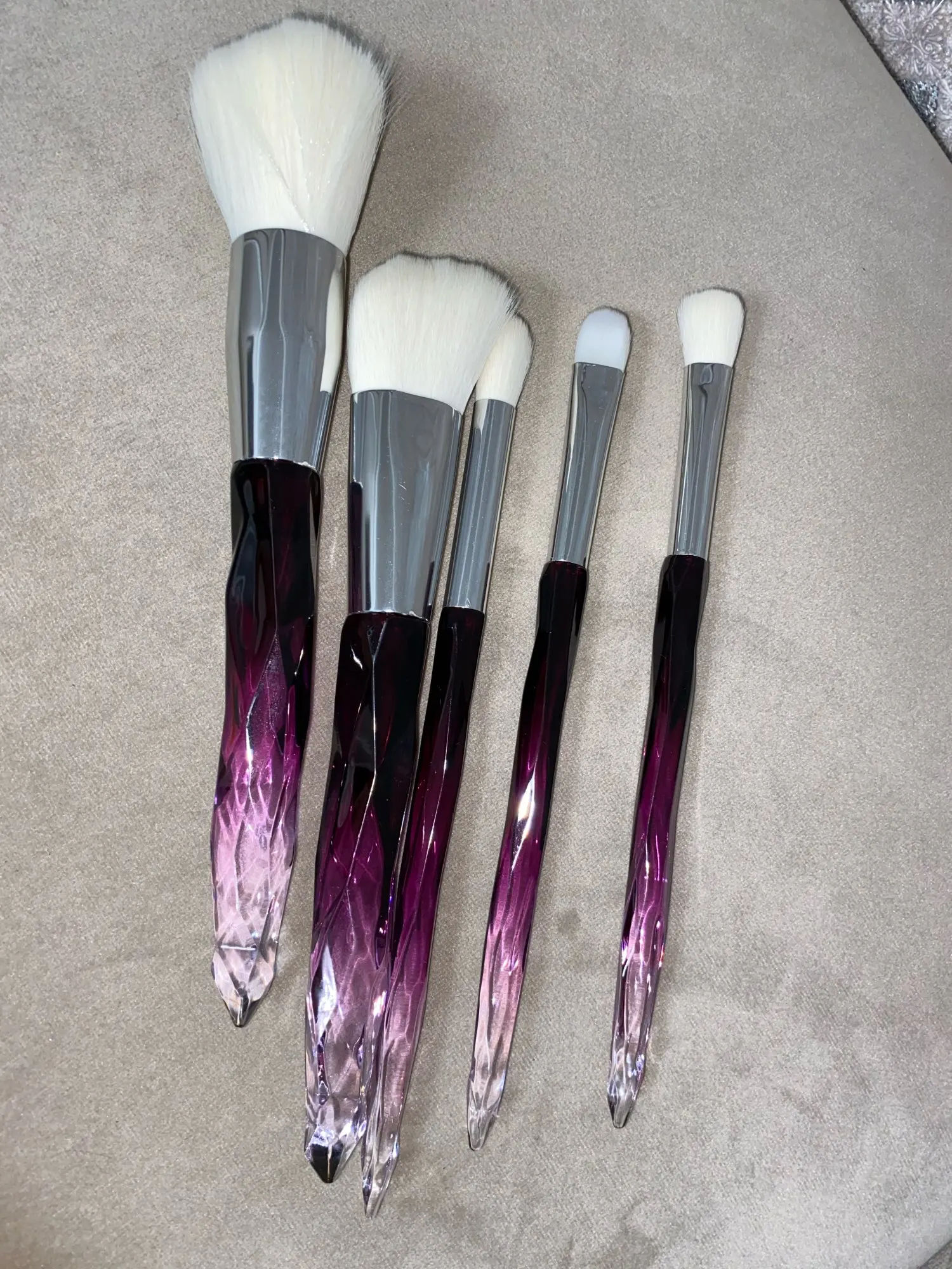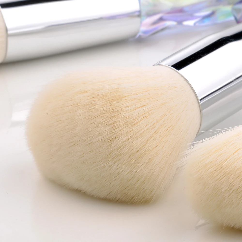 Кисти пришли за месяц. Думала что ручка будет прозрачной, но нет, на ней матовое покрытие((( цвет конечно красивый, и материал приятный на ощупь, но думаю что быстро эта красота затрется (проблема всех матовых покрытий). Покупала весь набор только из-за скошенной кисти, но она оказалась криво острижена. Неприятно. В целом кисти вроде ничего, мягкие, приятные, но погрешности ввиде торчащих волосков все-же есть.