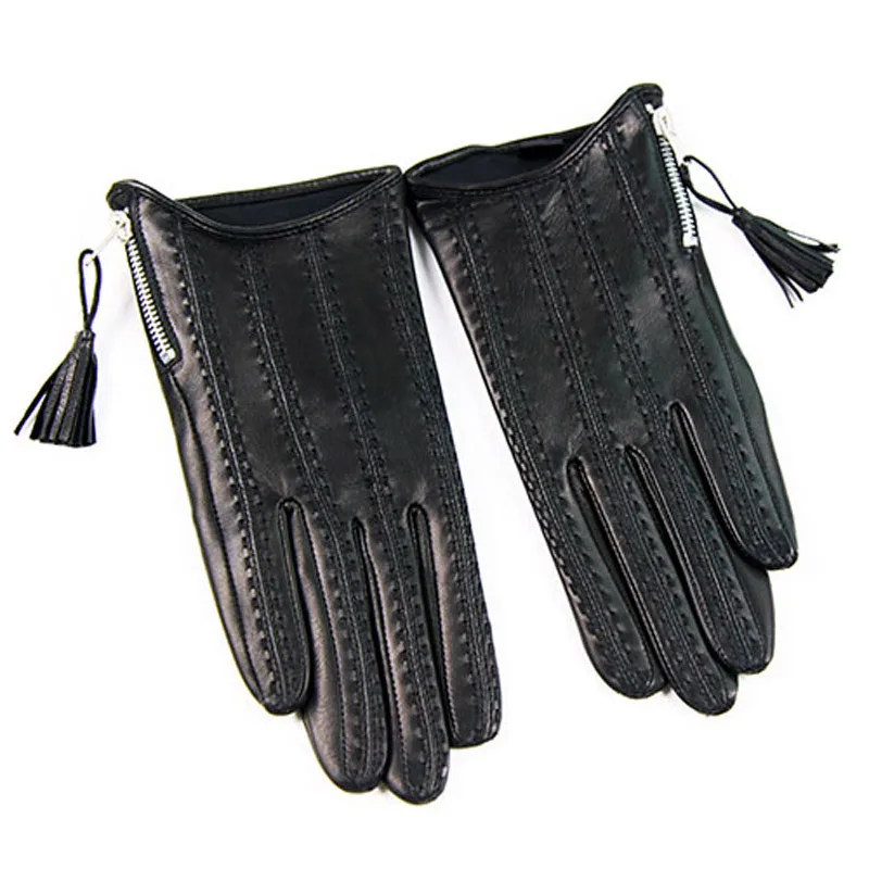 Перчатки женские кожаные из овечьей кожи, на молнии, с кисточками