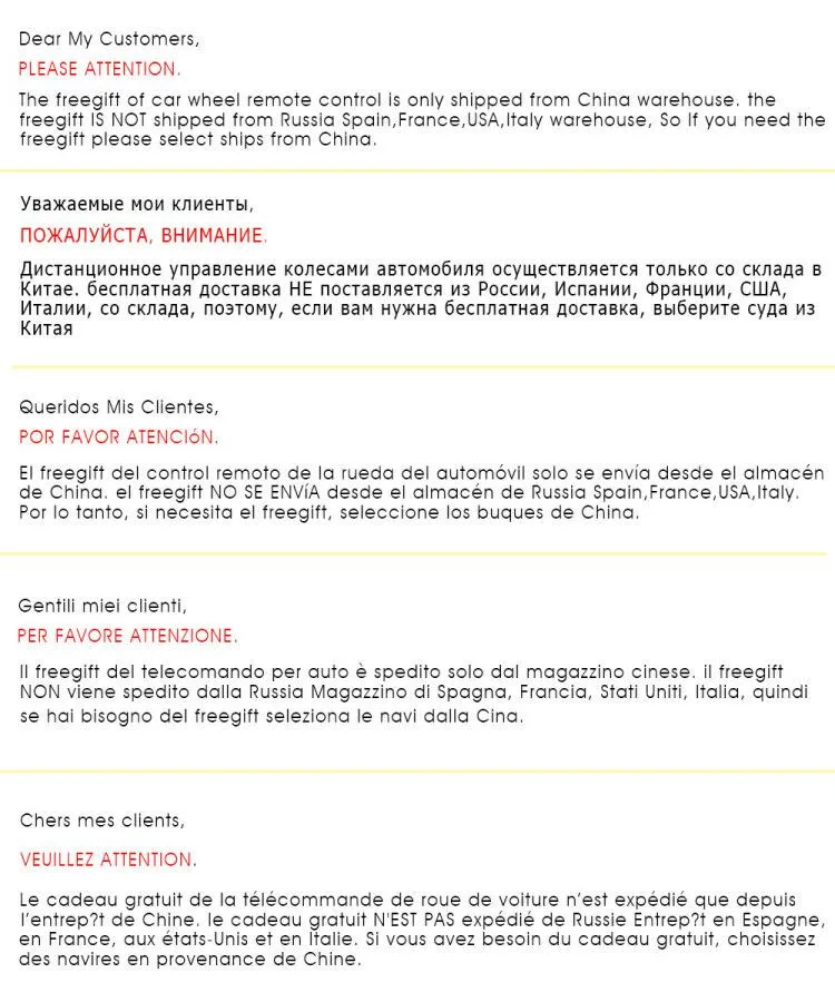 Пожалуйста, обратите внимание.Бесплатный подарок дистанционного управления автомобильным колесом поставляется только со склада Китая. Бесплатный подарок не доставляется из России, Испании, Франции, США, Италии, так что если вам нужен бесплатный подарок, пожалуйста, выберите корабль из Китая.