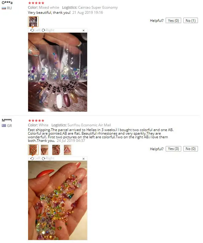 Я попробовал это для своего нейл-арта. Стразы Красивые и соответствуют описанию на фотографиях. Я снова буду покупать у этого продавца.