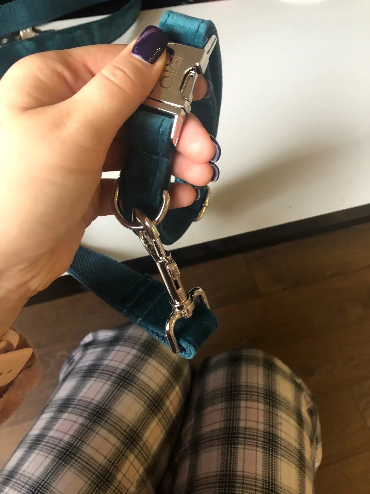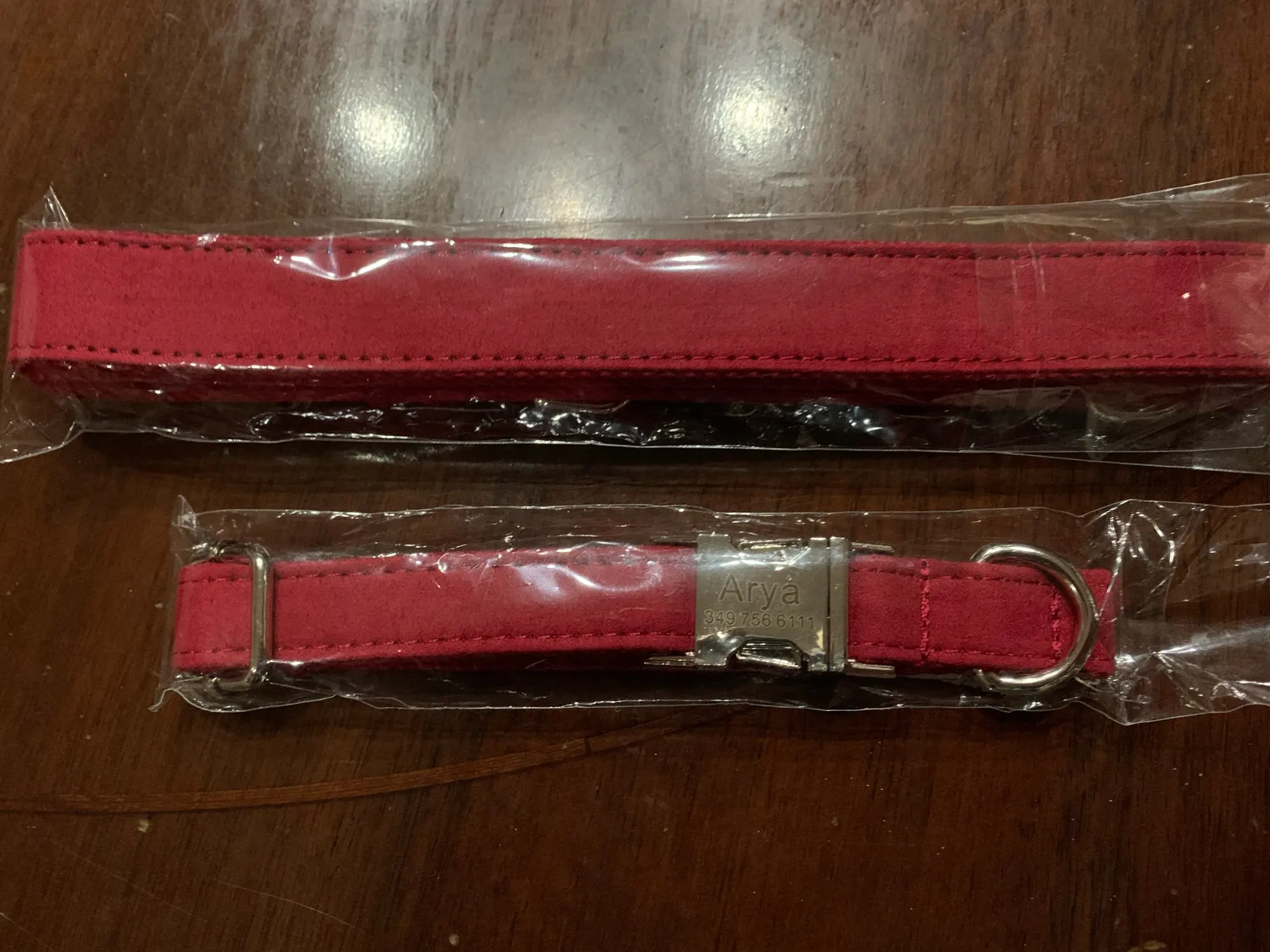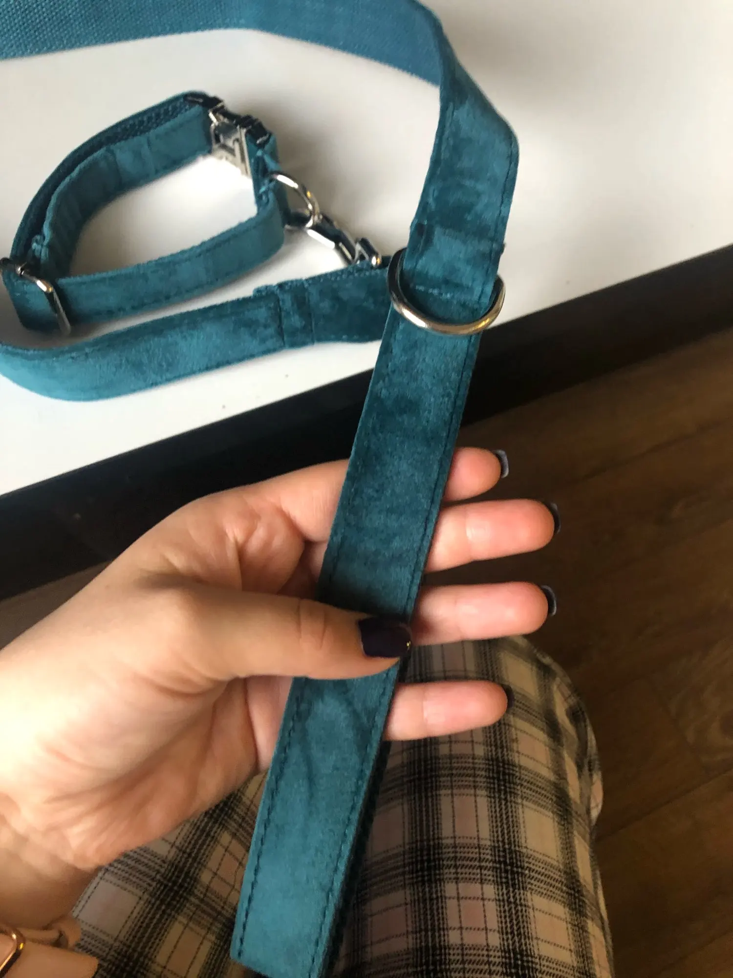Милый собачий ошейник и поводок, приятный на ощупь (как будто из велюра), гравер сделан хорошо, для серебряных деталей нет царапин, стоит своих денег :) ошейник может плотно подогнать, если дело доходит до цепи. Рекомендуем!