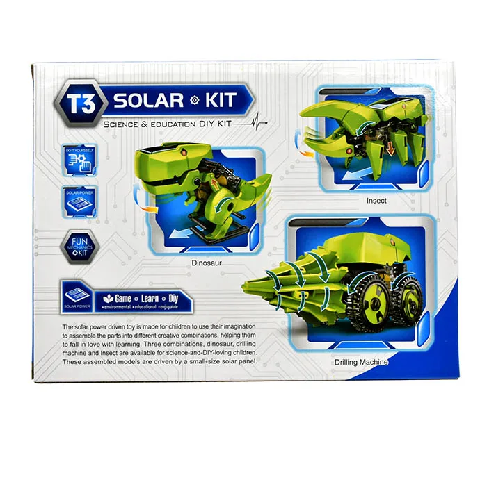 Особенности:1. Он оснащен простой установкой и может тренироваться при помощи рук.2. Оснащен солнечной панелью. После установки поместите его в прямой солнечный свет для питания. Экологически чистый, энергосберегающий и не загрязняющий окружающую среду.3. 4 формы, динозавры, роботы, дриллеры, жуки-Геркулес. Это 3-в-1 игрушка «сделай сам» с мощным воспроизведения.Подходит для: 3-10 летСписок товаров:1 * DIY 3-в-1 солнечной энергии Робот (составных частей + инструкция)