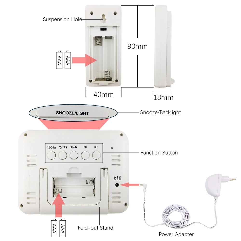 Различные функции, включая ежедневный будильник, повтор, термометр, оповещение о температуре в помещении/на открытом воздухе, прогноз погоды, гигрометр, монитор влажности, календарь и время и т. д.