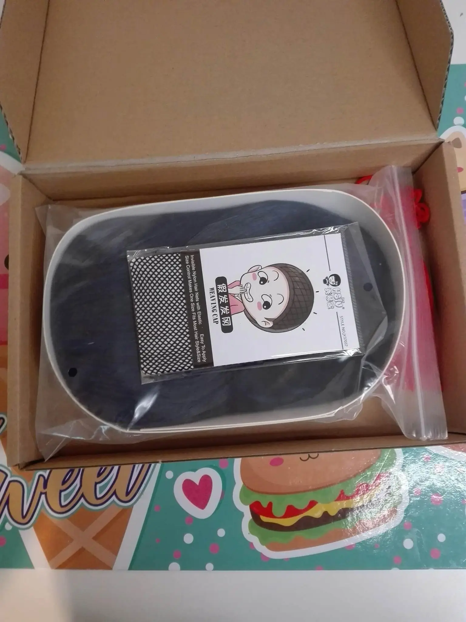 Все отлично, парик защищен защитный экран, hairnet хорошее качество, все упаковано в милую бумажную коробку. Очень маленький сюрприз;)