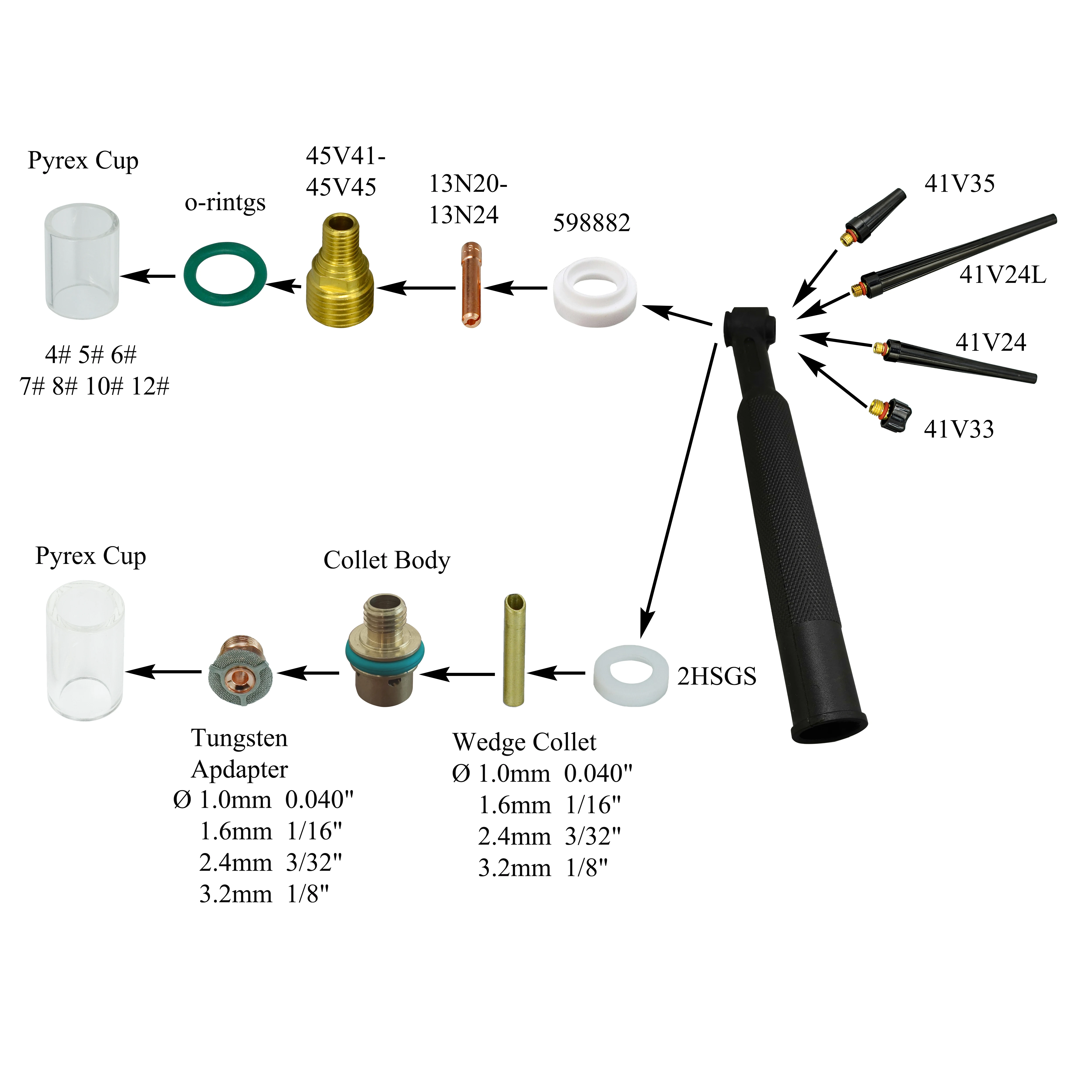 1 x Ø6mm 4 # стеклянная чашка Pyrex1 x Ø8mm 5 # стеклянная чашка Pyrex1 x Ø10mm 6 # стеклянная чашка Pyrex1xø11 мм 7 # стеклянная чашка Pyrex1xø13 мм 8 # стеклянная чашка Pyrex1xø16 мм 10 # стеклянная чашка Pyrex1 x Ø21mm 12 # стеклянная чашка Pyrex1 x короткая задняя чашка 41V331x41V35 средняя задняя чашка1x41V24 длинная задняя чашка1 х TIG изоляторы чашки прокладки 5988821x45V42 .040 "Ø1.0mm TIG газовый корпус объектива1x45V43 1/16 "Ø1.6mmTIG корпус газовых линз1x45V44 3/32 "Ø2.4mm TIG корпус газового объектива1x45V45 1/8 "Ø3.2mmTIG корпус газовых линз1x13N21 .040 "Ø1.0mm TIG Цанга1x13N22 1/16 "ø1.6 мм TIG Цанга1x13N23 3/32 "ø2.4мм TIG Цанга1x13N24 1/8 "ø3.2мм TIG Цанга20 шт термостойкие уплотнительные кольца.
