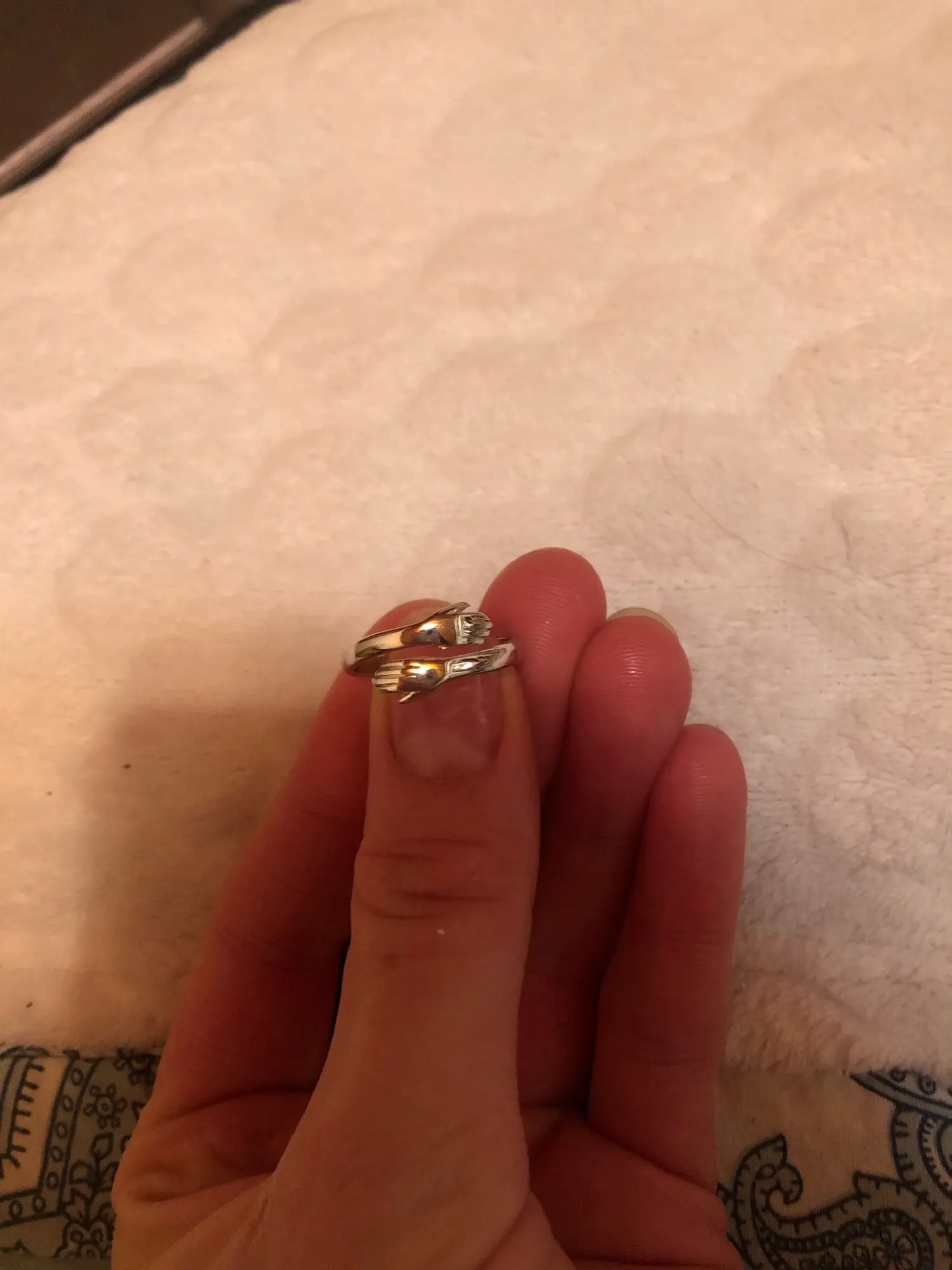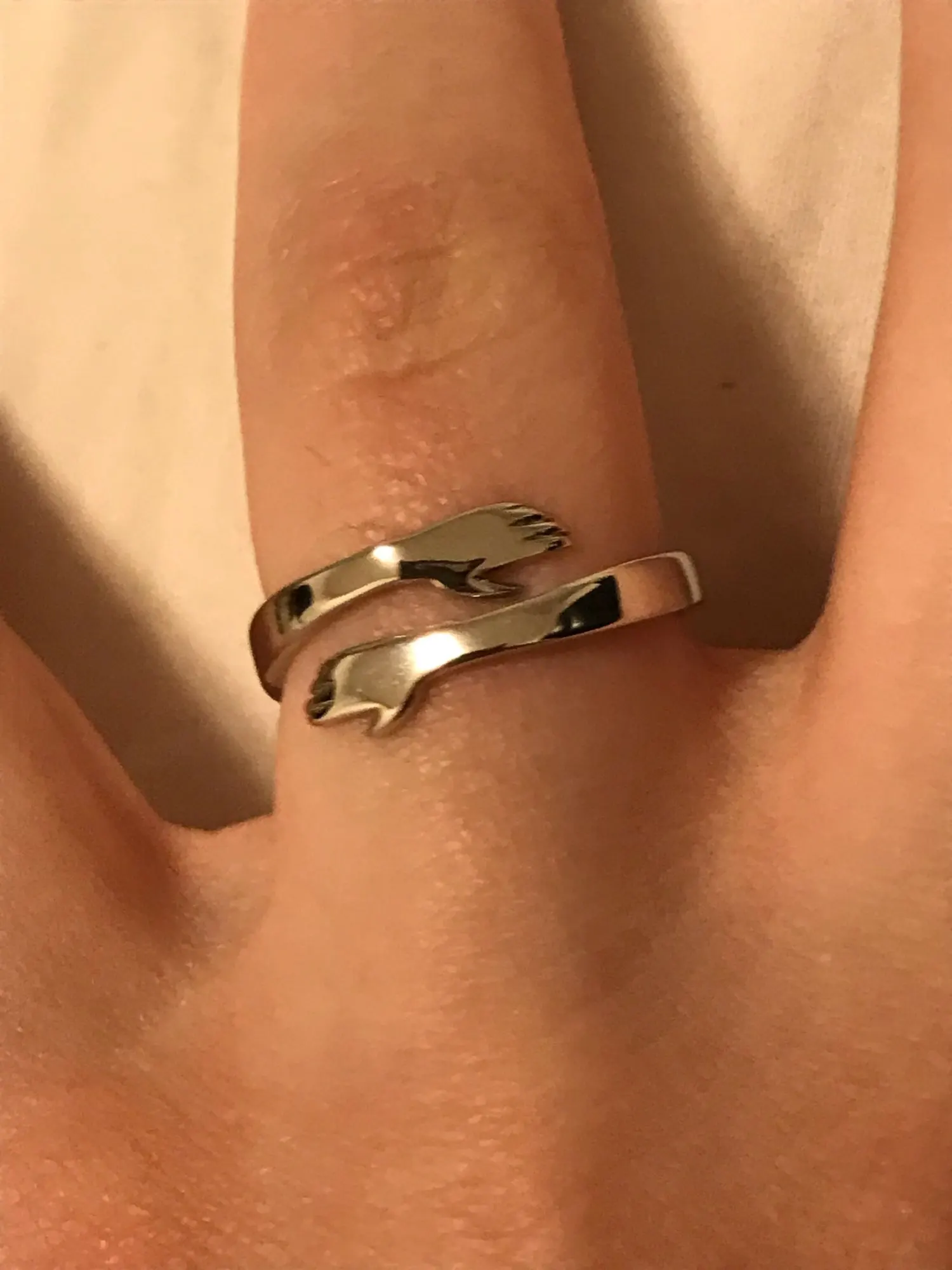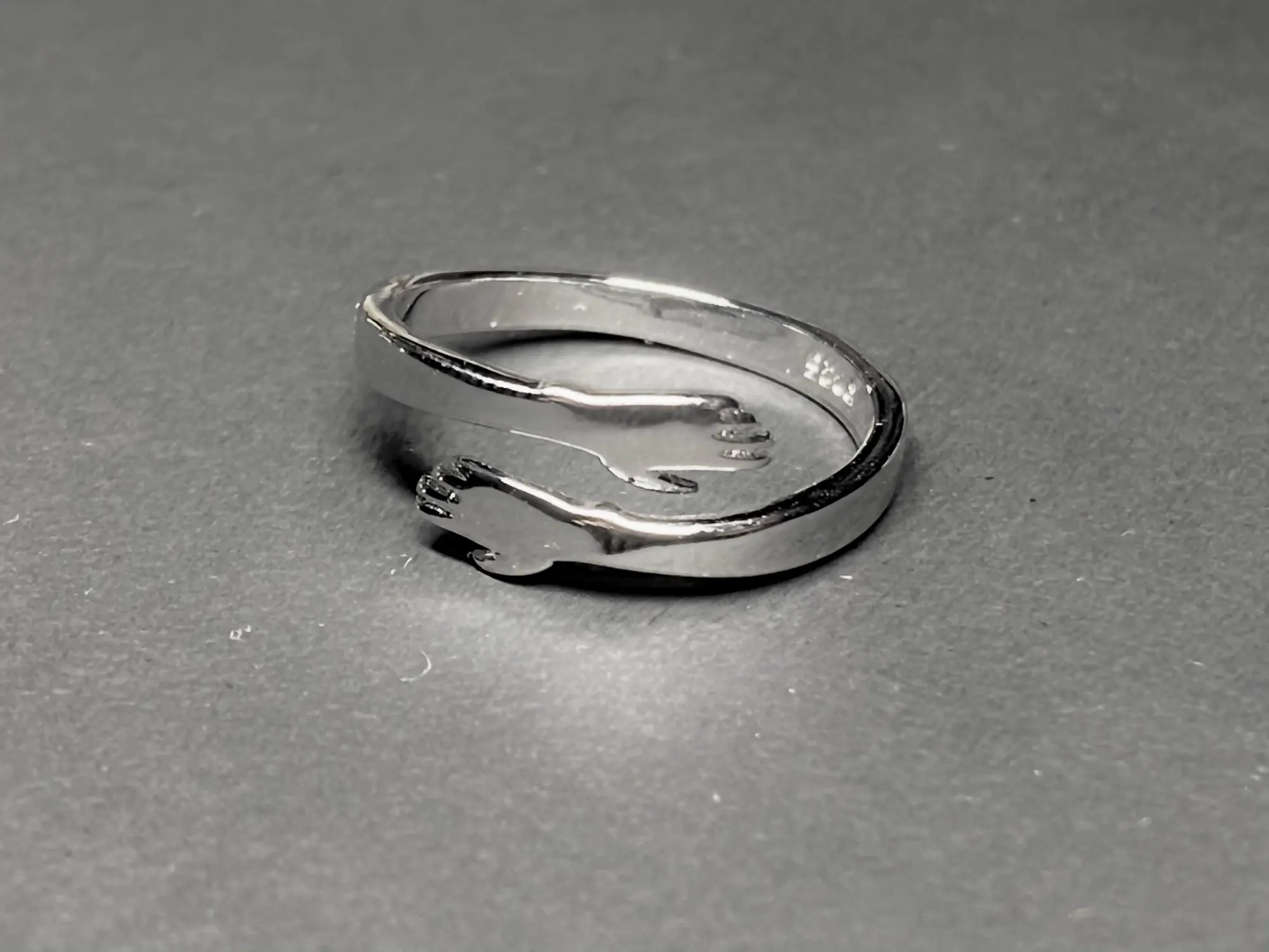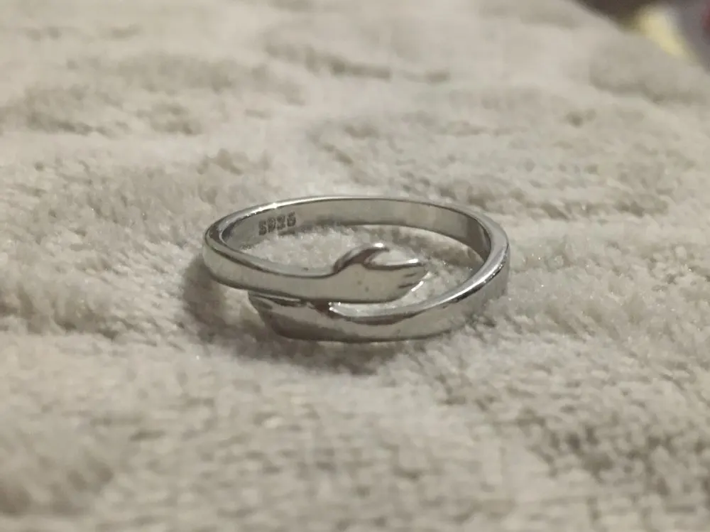 Отличное кольцо! С металлическим блеском, не матовое. Оно не такое белое, как серебро, но металл выглядит всё равно красиво. Приятная деталь - большие пальцы на "руках" смотрят вверх (а не в разные стороны, как на картинке). Мне так нравится больше - так больше похоже на объятия)) по размеру регулируется легко, сидит на пальце крепко. Пришло где-то за 1,5 месяца.