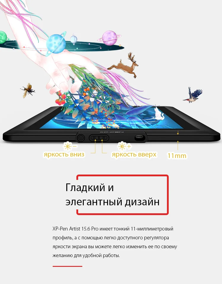 Доставка дольше чем ожидал. 14 дней со склада в России. Иногда с Китая быстрее долетает. В остальном всё супер! Планшет качественный, красивый. Приятный на ощупь. Колёсико плавное. В комплекте всё необходимое, как и должно быть! Подставка, защитная плёнка, перчатка, тубус для стилуса и даже тряпочка. Вроде мелочь, а приятно. (не то что у одного известного бренда, имя которого все знают. Планшет и стилус, остальное докупать за нехилые деньги...) Что касается размера. Долго выбирал 13,3" или 15,6". Всё-таки решился на 15,6" и не пожалел. Рисовать конечно и на 13,3" можно, но полной картины на экране не будет. Всем советую и планшет и размер. Спасибо XP-PEN!