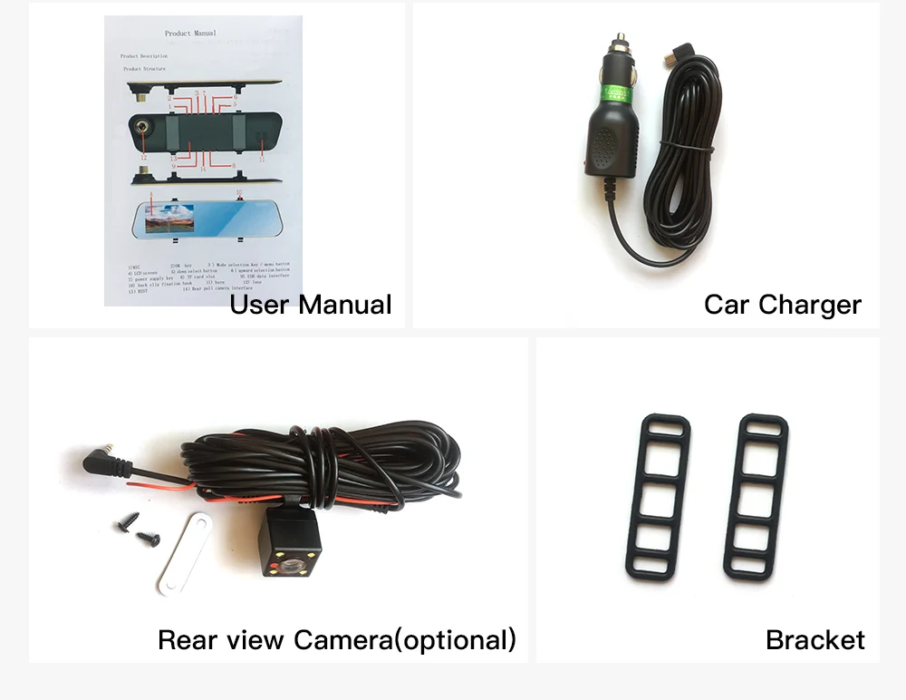 Автомобильное зеркало заднего вида DVR посылка включает в себя: 1 * Автомобильное Зеркало DVR 1 * зарядное устройство 1 * Руководство пользователя 1 * Камера заднего вида