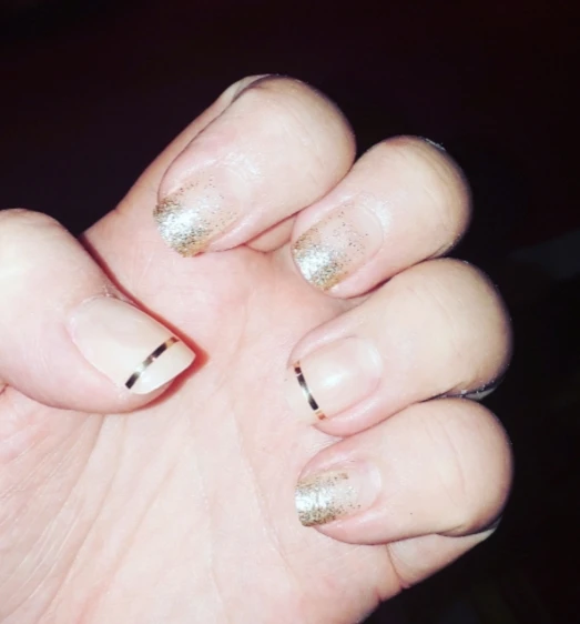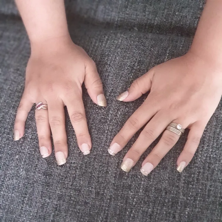 Они очень красивые, красивые. И они не выцветают, они поставляются 24 шт. разных размеров ногтей и двустороннего клея, они, кажется, хорошо прилипают и после использования они также хорошо удаляют клей. Я не знаю, что они сделают после того, как прослужат несколько часов. Теперь я понимаю, что кладу его назад, хорошо, это может быть двумя способами, с блеском на части кутикулы или на кончике ногтей.
