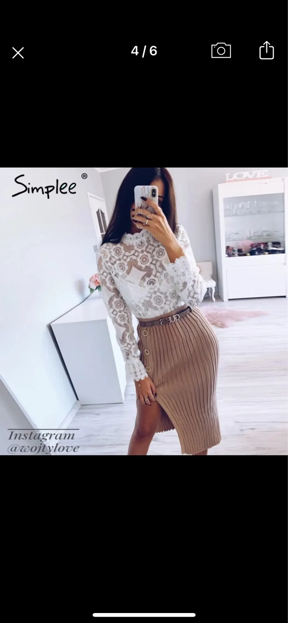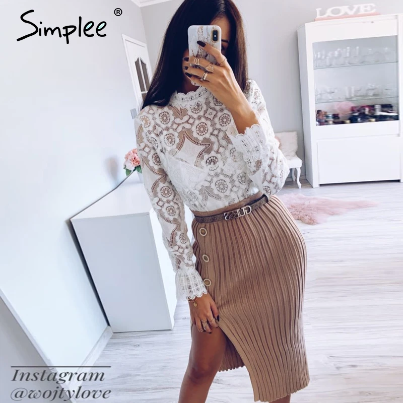 Женская белая блузка Simplee с рюшами, элегантная рубашка с полыми вышитыми кружевами и с длинным рукавом в форме фонарика, топ для лета и вечеринки, 2019