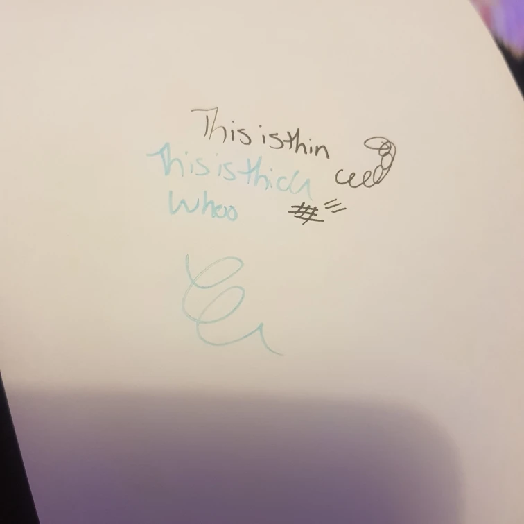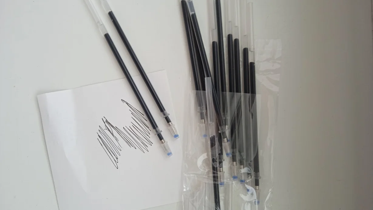 Заправки пишут очень хорошо, яркий черный и однотонный. Нижняя сторона-заправка в 2 раза тоньше, чем стандартная заправка гелевых ручек, ширина такая же, как и Обычная Ручка-роллер.